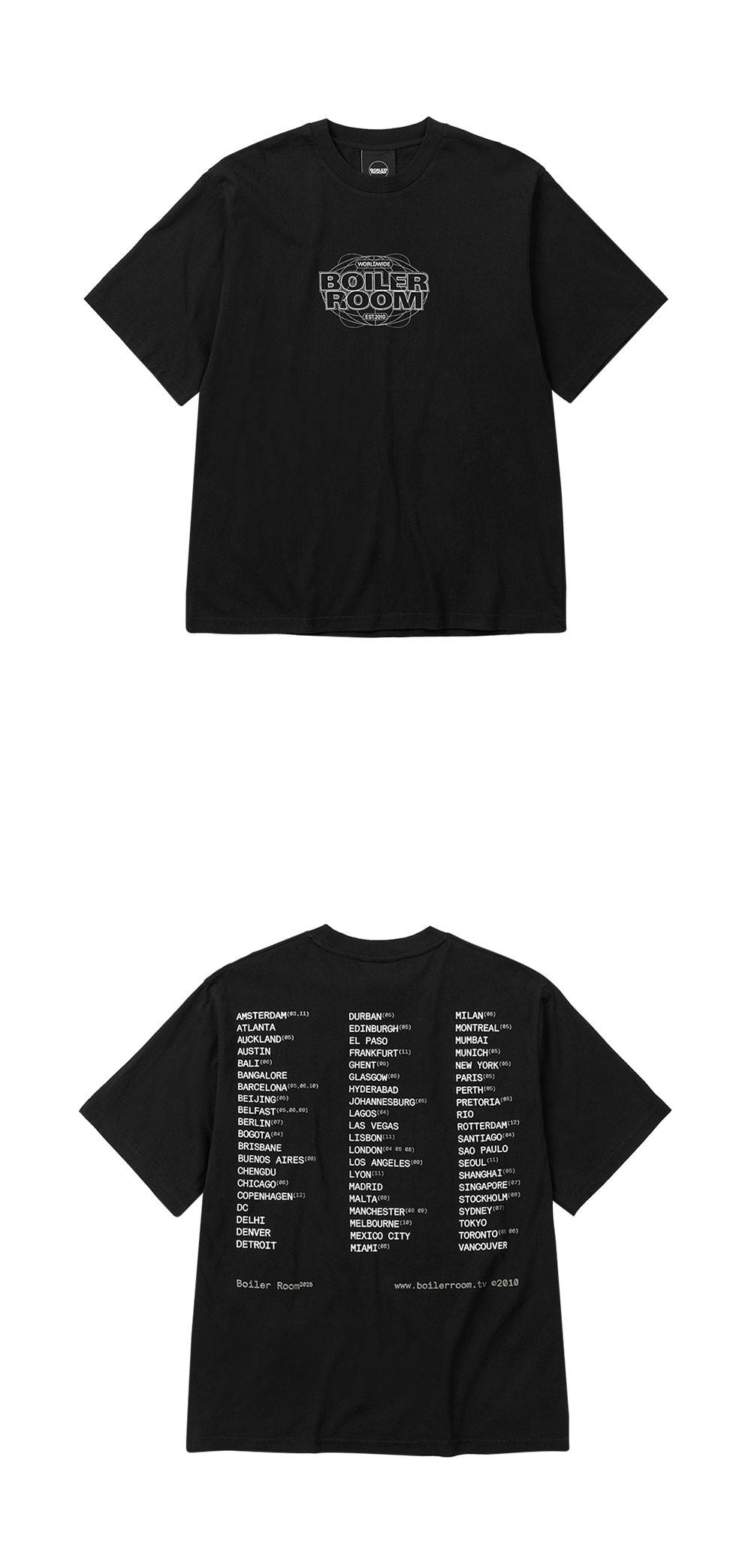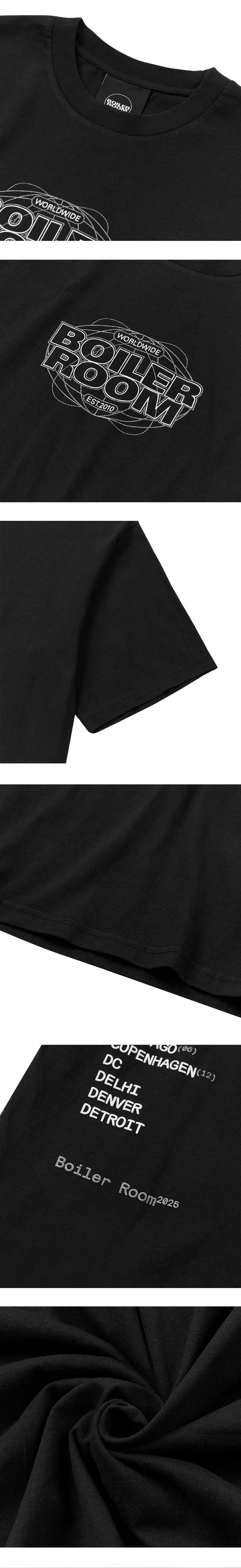 블랙 바탕에 화이트 그래픽 포인트가 매력적인 보일러룸의 월드 투어 티 블랙입니다. - 박시 핏 티 - 무거운 면직물 - 가슴과 등에 그래픽 프린팅 - 면 100%