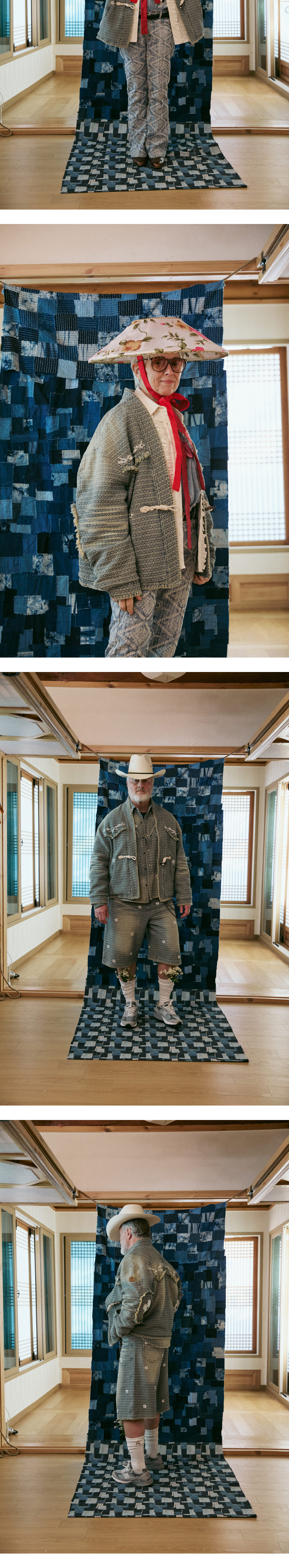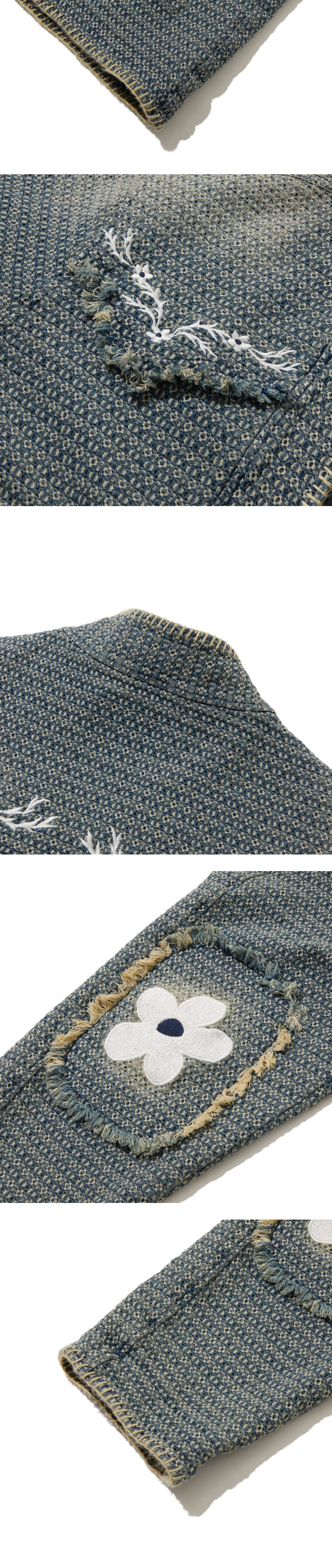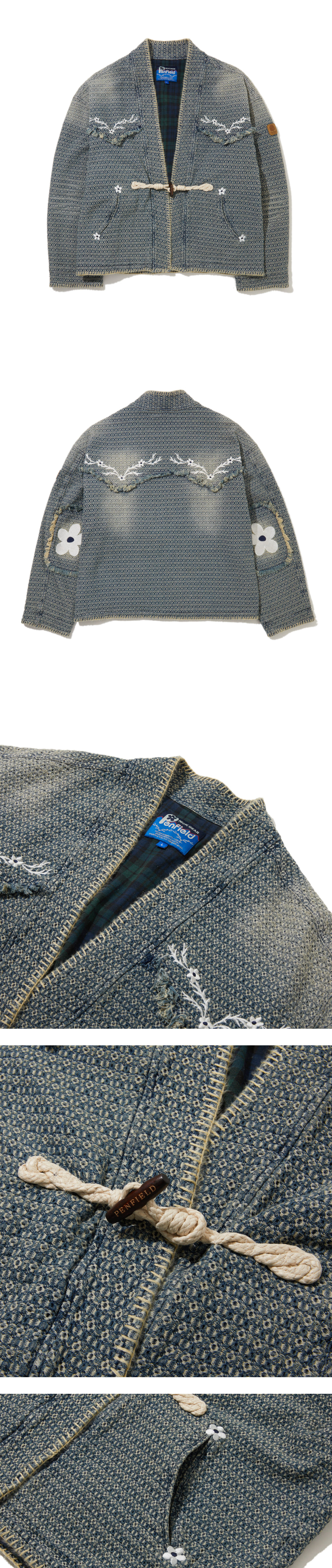 사시코를 연상시키는 쟈가드 데님 원단을 사용했습니다. 안감으로 워싱 공정에 반응하는 체크 원단을 사용했습니다. 강한 워싱 후, 다시 다잉으로 복합적인 공정을 거쳐 빈티지한 질감, 색감으로 완성했습니다. 데끼로 마감한 웨스턴요크 위로 펜필드X닉기어의 콜라보 그래픽을 자수로 표현했습니다 로브형태에 파이핑 포켓으로 웨스턴 무드를 더했습니다. MERROW사의 특수 봉제기계로 앞단작, 소매단, 밑단을 마감했습니다.