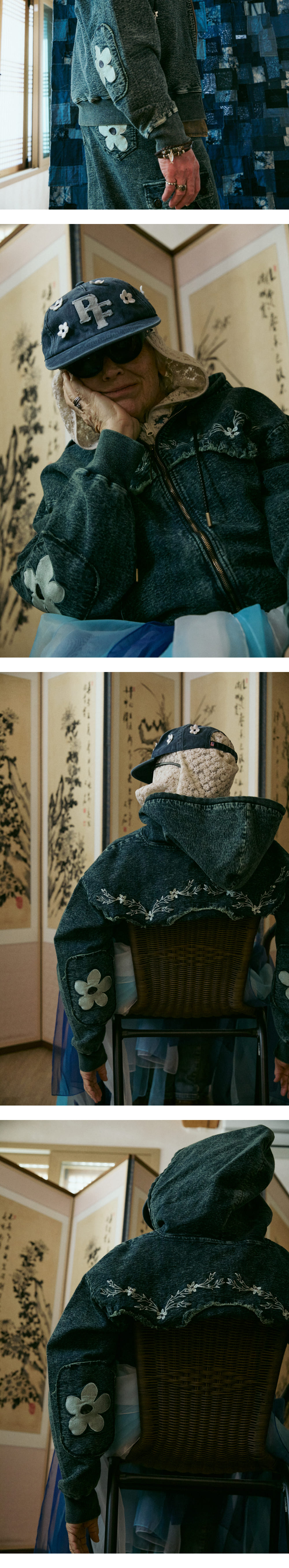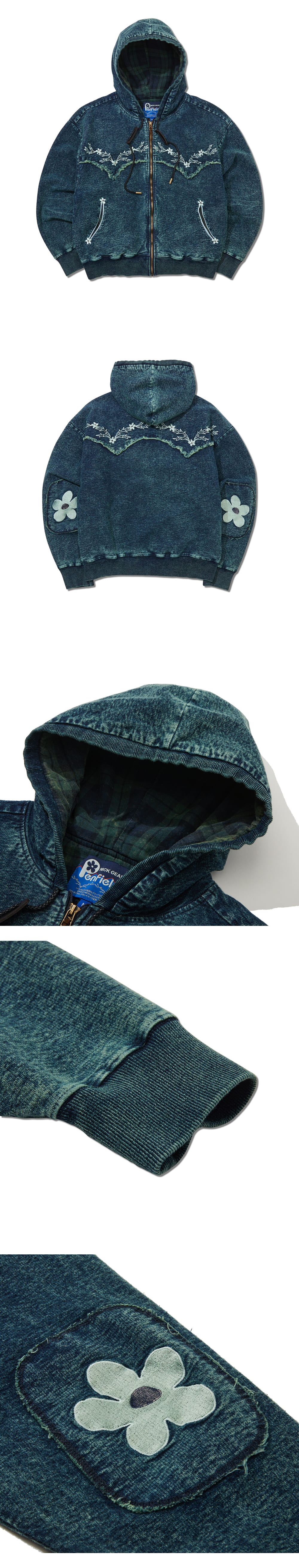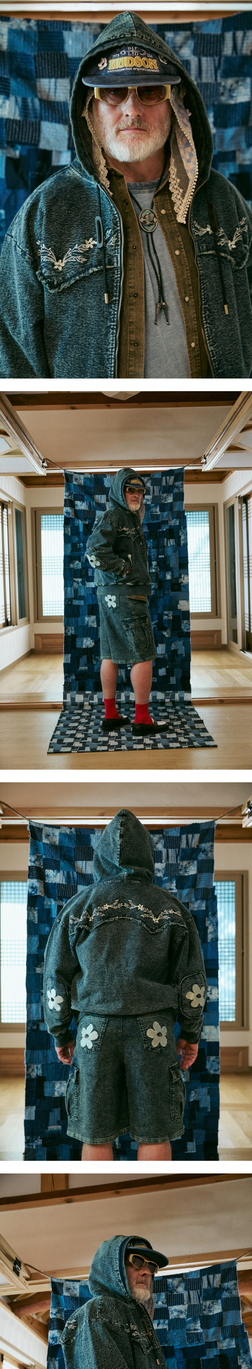 인디고 원사로 직조된 직물(우븐)과 같은 조직감을 가진 편물(다이마루) 원단입니다. 안감으로 워싱 공정에 반응하는 체크 원단을 사용했습니다. 강한 워싱 후, 다시 다잉으로 복합적인 공정을 거쳐 빈티지한 질감, 색감으로 완성했습니다. 데끼로 마감한 웨스턴요크 위로 펜필드X닉기어의 콜라보 그래픽을 자수로 표현했습니다 후드집업에 파이핑 포켓으로 웨스턴 무드를 더했습니다.