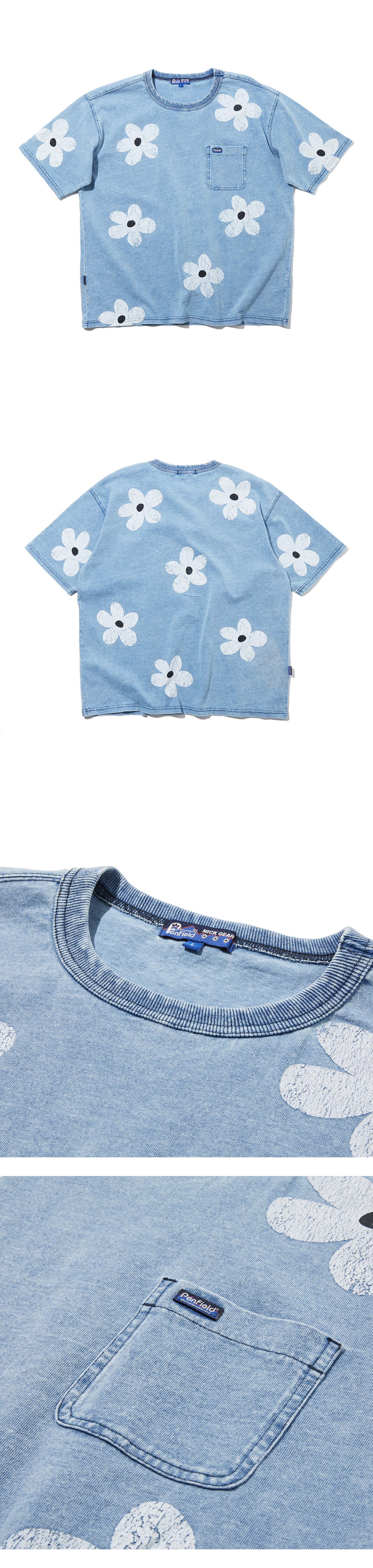닉기어 x 펜필드 인디고 틴워싱 플라워 패턴 포켓 반팔티 라이트인디고