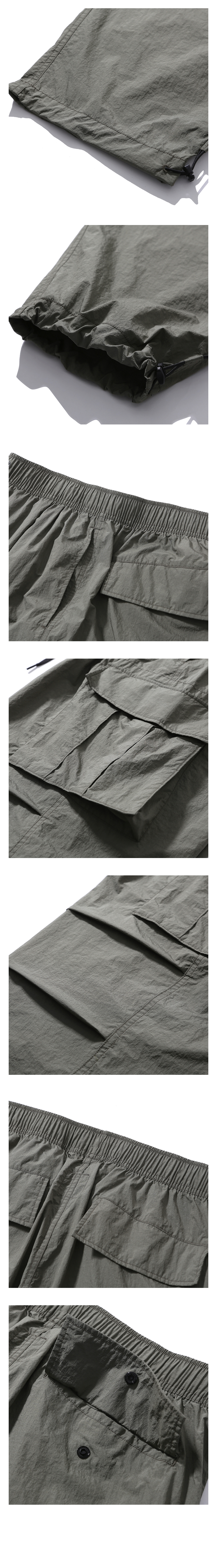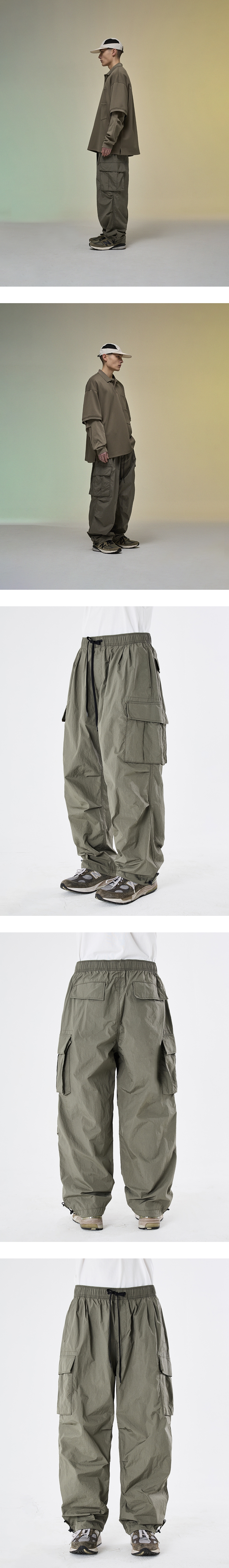 넉넉한 수납공간을 갖춘 밀리터리 팬츠 · 여유롭고 편안한 느낌의 실루엣. · 메탈릭 한 표면감의 립스탑 크링클 나일론 원단 사용. · 넉넉한 사이즈의 카고 포켓을 포함한 6개의 포켓으로 구성. · 허리와 무릎에 턱을 넣어 편안한 착용감과 풍성한 실루엣 연출. · 허리 스트링과 지퍼 플라이 사양. · 실루엣 조절이 가능한 밑단 스트링으로 2가지 타입으로 연출 가능.