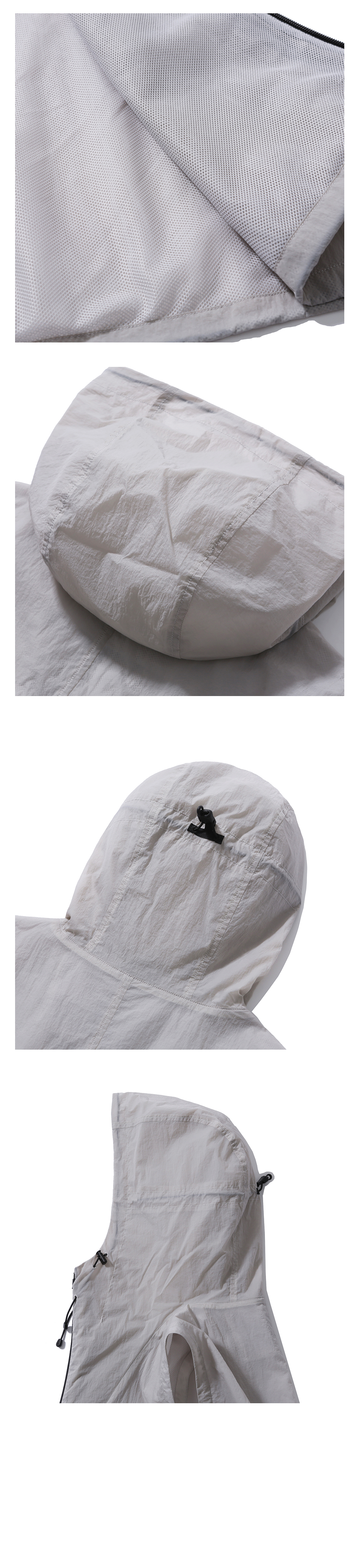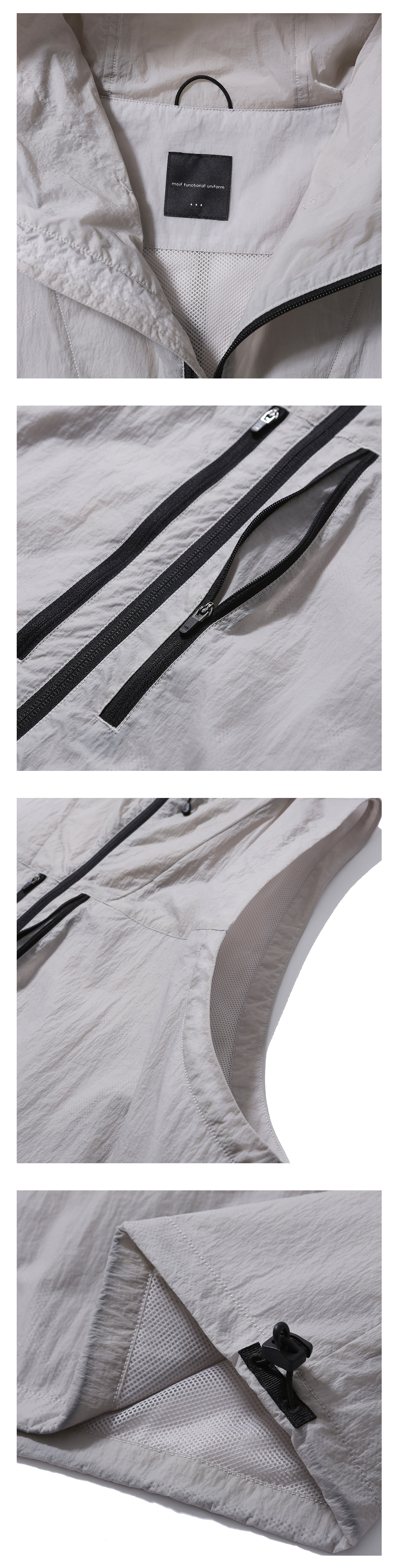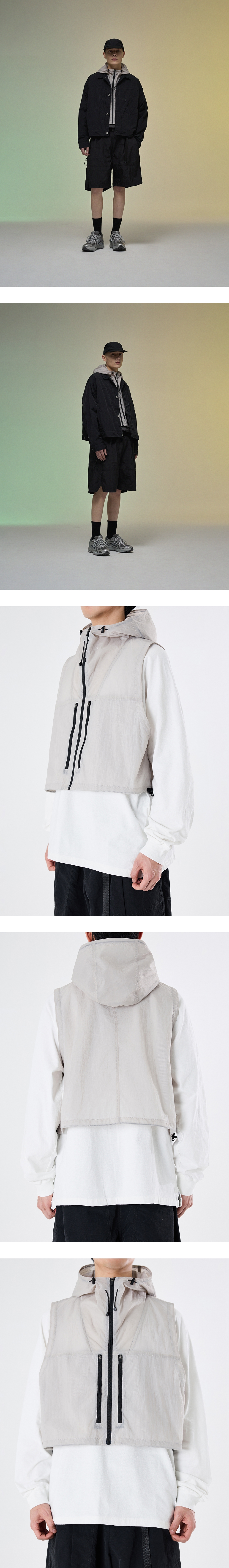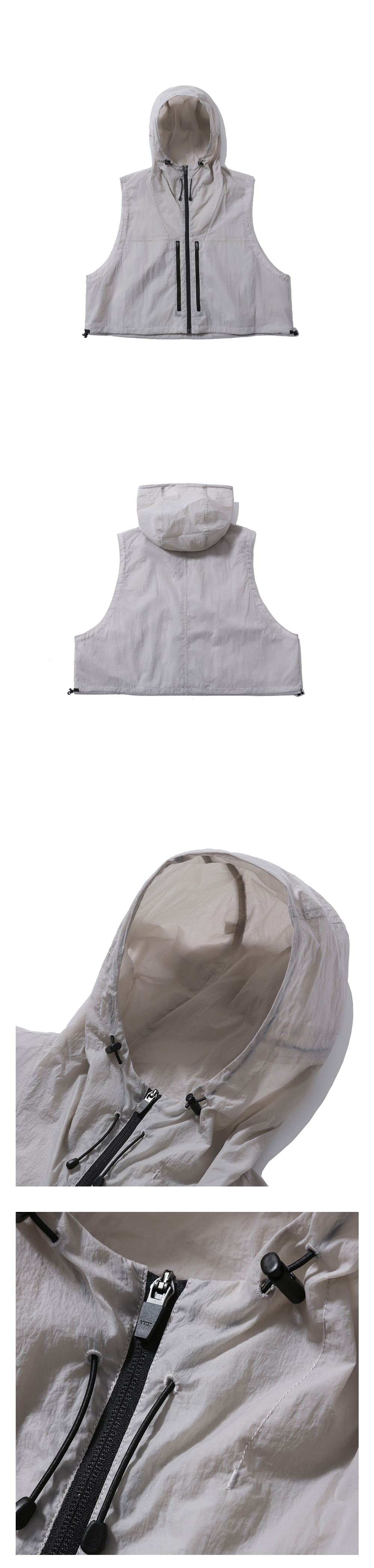 레이어드에 용이한 짧은 기장의 베스트 · 여유 있는 편안한 실루엣. · 사각거리는 나일론 원단 사용. · 지퍼를 사용한 앞여밈 사양. · 지퍼로 여닫을 수 있는 양쪽 가슴 주머니. · 네크라인과 후면 중앙에 스토퍼로 조절이 가능한 후드 사양. · 실루엣 조절이 가능한 밑단 스트링과 스토퍼 사양. · 넉넉한 실루엣으로 아우터 위로도 레이어링 하여 연출 가능.