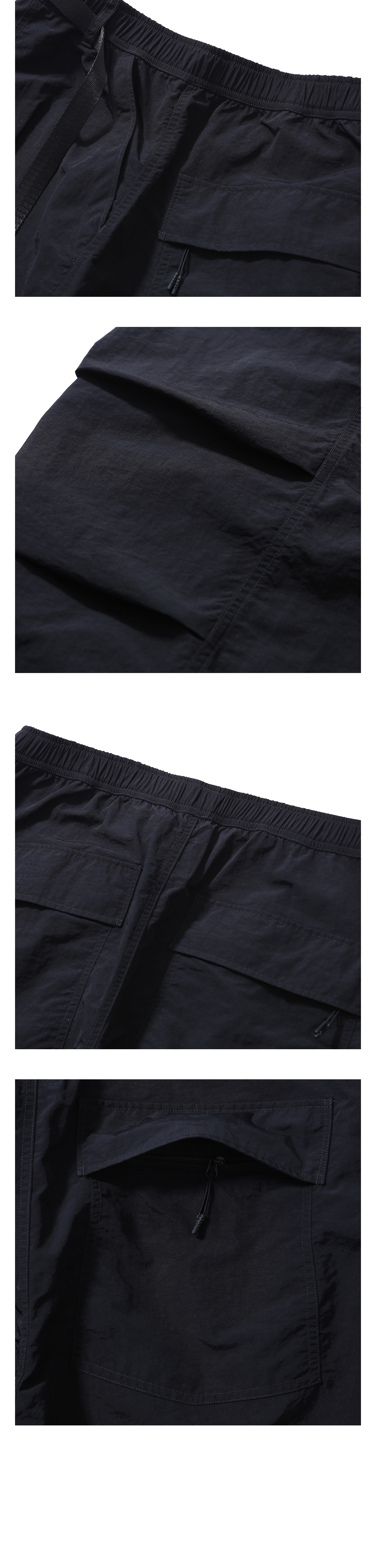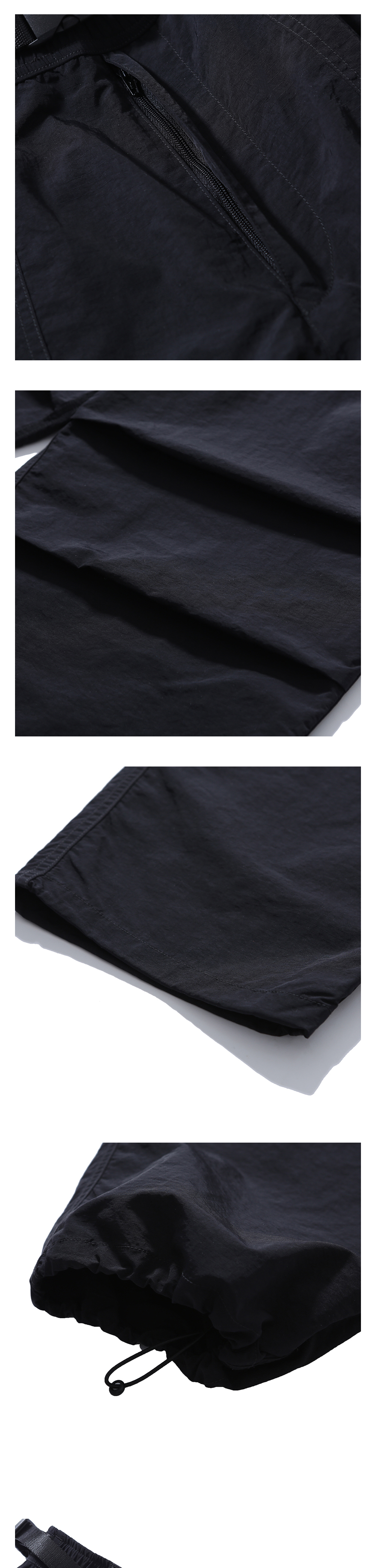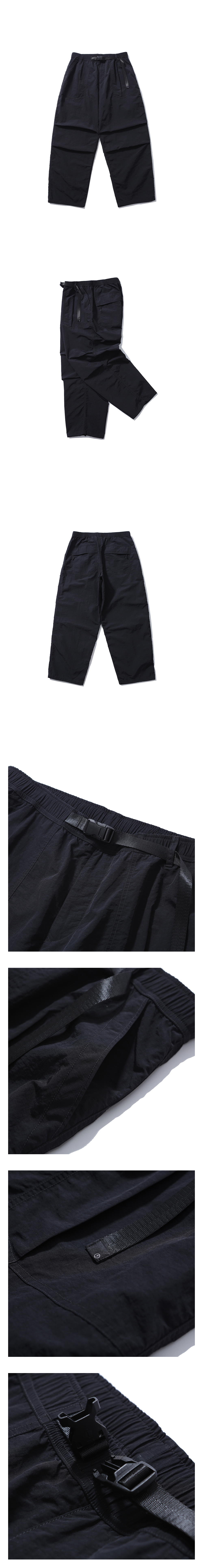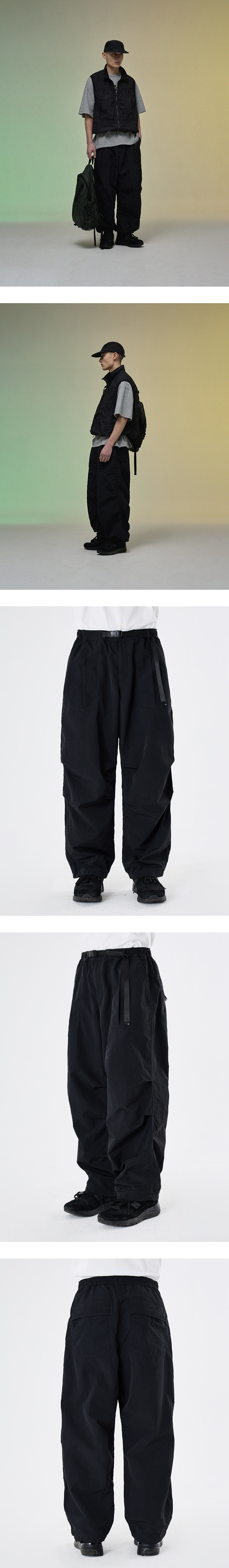 밀리터리 퍼티그 팬츠를 재해석한 아이템 · 여유 있는 편안한 실루엣. · 내구성이 좋은 나일론 립스탑 원단 사용. · 가벼운 물방울과 바람을 막아주는 방풍 및 발수 가공 처리된 원단. · 전면부 직사각형 패치 포켓. · 지퍼와 덮개가 부착되어 중요한 소지품 수납에 용이한 후면부 패치 포켓. · 무릎에 턱을 넣어 편안한 착용감과 풍성한 실루엣 연출. · 신축성 있는 내장형 이밴드와 사이즈 조절이 가능한 허리 벨트 사양. · 실루엣 조절이 가능한 밑단 스트링으로 2가지 타입으로 연출 가능.
