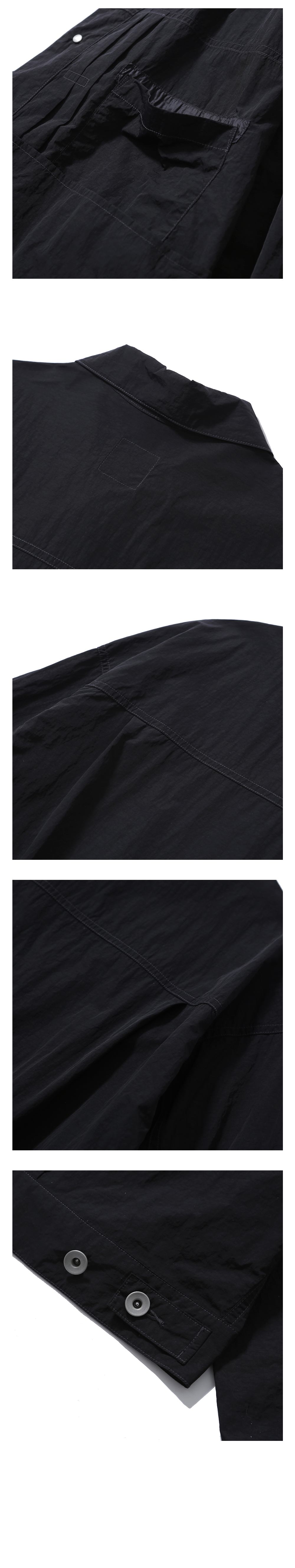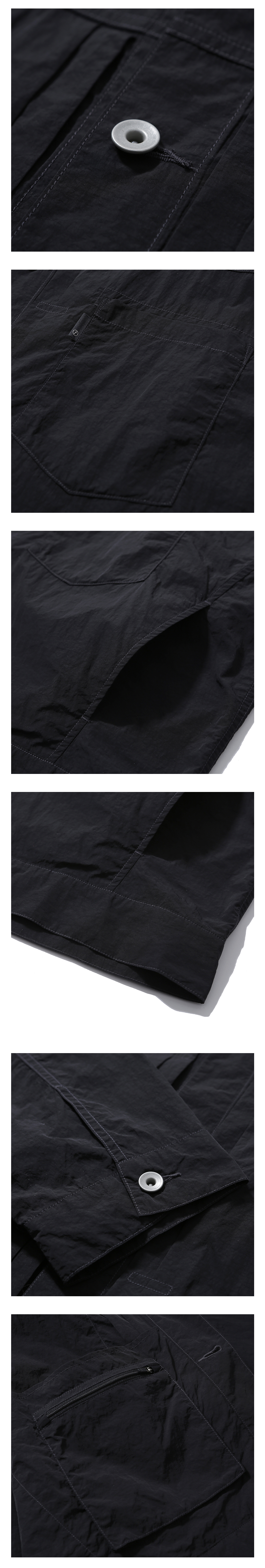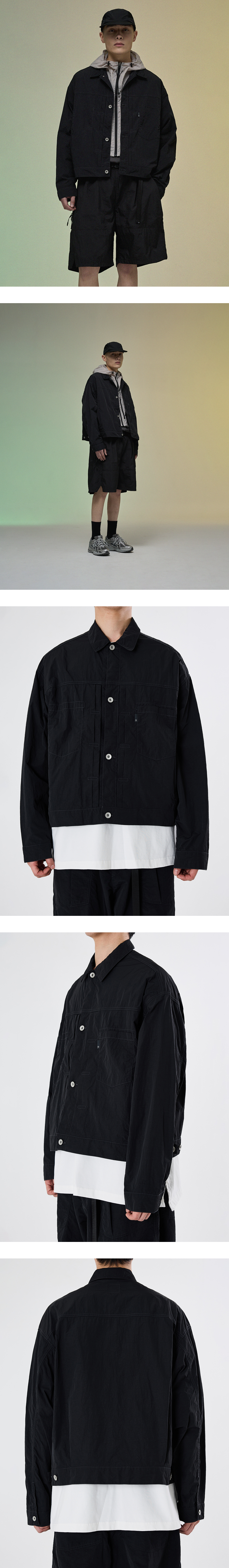 빈티지 데님 재킷을 재해석한 트러커 재킷 · 여유 있는 오버사이즈 실루엣. · 얇고 부드러운 나일론 원단 사용. · 가벼운 물방울과 바람을 막아주는 방풍 및 발수 가공 처리된 원단. · 전면부 슬릿 포켓과 가슴 아웃포켓으로 구성. · 짧은 기장감으로 레이어링에 용이한 아이템.
