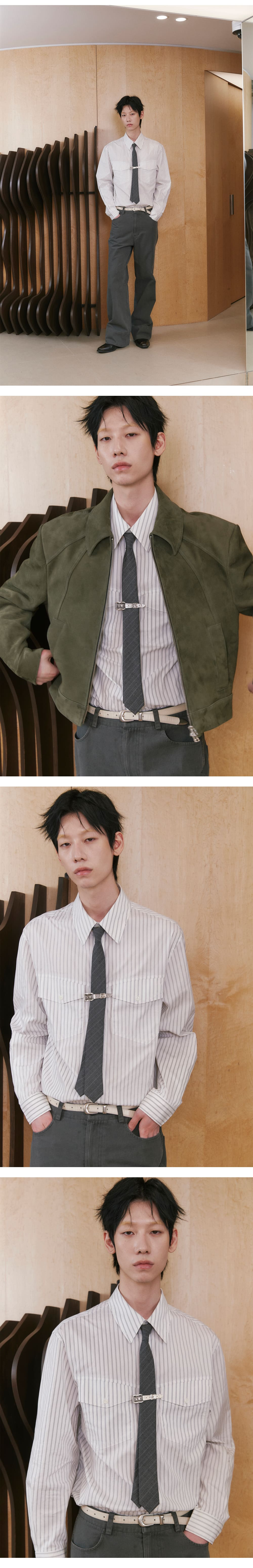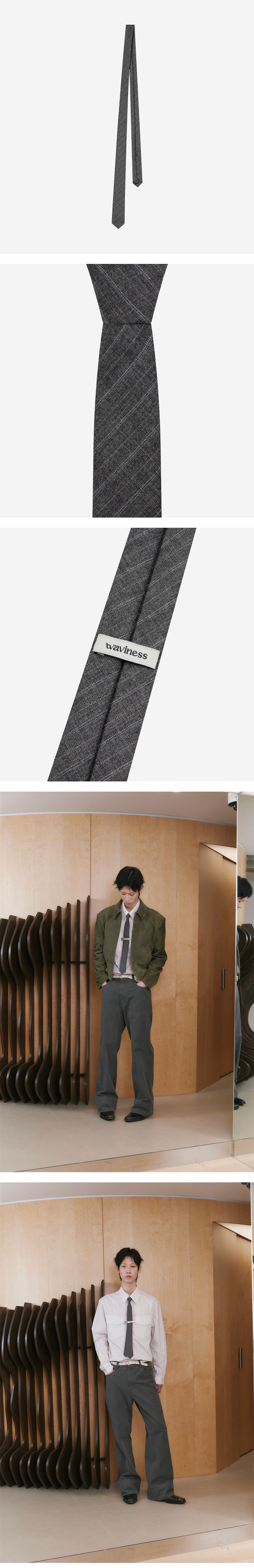 - 데드스탁 울 스트라이프 원단 - 은은하게 표현된 스트라이프 패턴 - 슬림타이 형태로 제작 - 여러 사이즈의 넥타이 샘플링을 통해 웨이비니스의 시그니처 라인 셔츠들과 가장 호환성이 좋다고 판단되는 대검 50mm, 소검 38mm로 제작됨 - Outshell Wool 100% - SIZE 소검 : 38mm 대검 : 50mm 길이 : 150cm MODEL 182cm 63kg ONE SIZE 착용 184cm 68kg ONE SIZE 착용 187cm 65kg ONE SIZE 착용