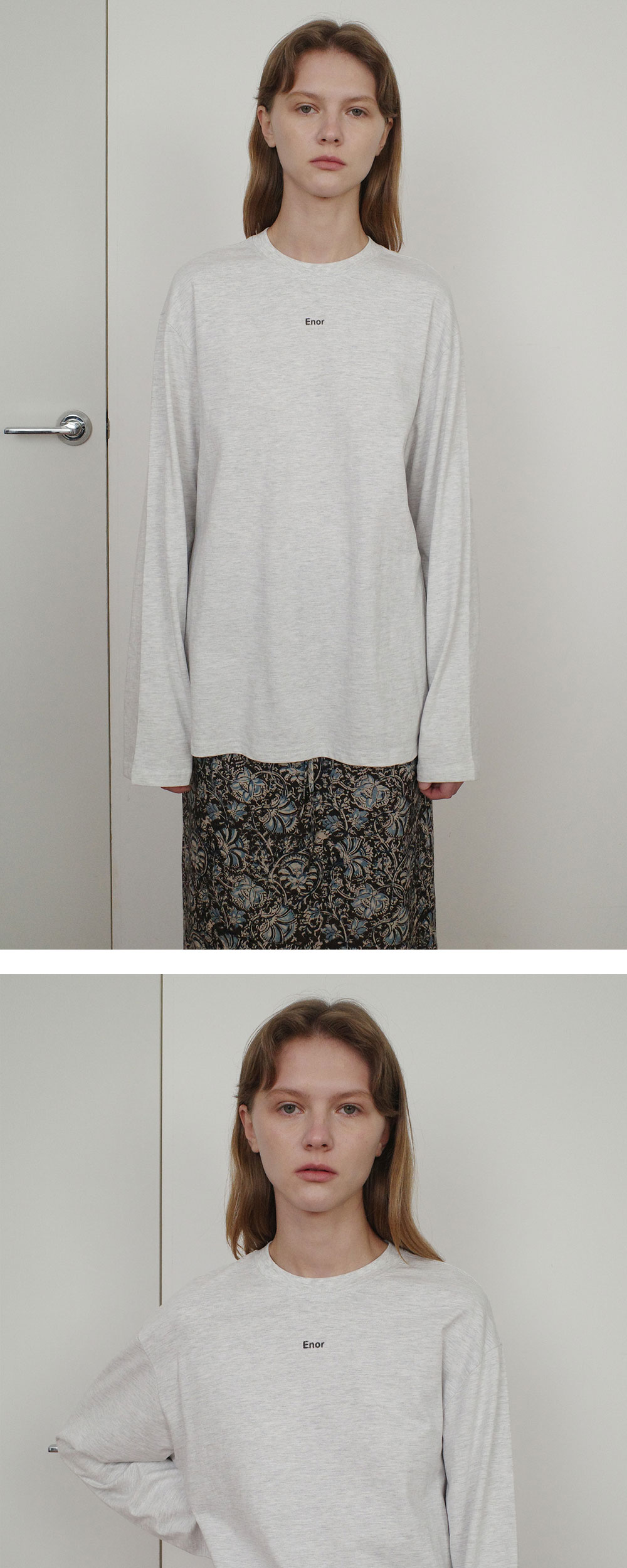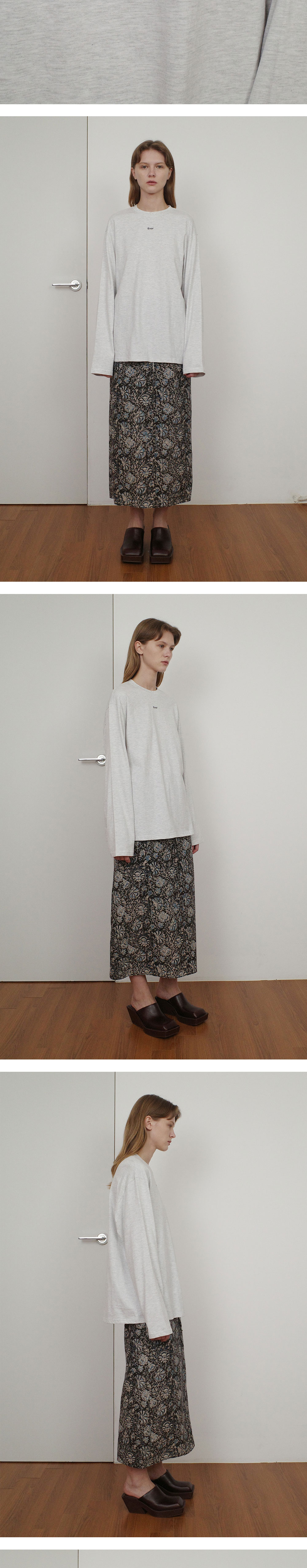 - 여유로운 실루엣의 베이직 롱 슬리브 티셔츠입니다. - 깔끔한 디자인으로 어떤 룩에도 조화롭게 스타일링이 가능합니다. - 답답하지 않은 넥 라인과 루즈한 핏으로 체형과 관계없이 편안한 착용감을 느낄 수 있습니다. - 앞판에 엔오르 로고 나염으로 마무리하였습니다.