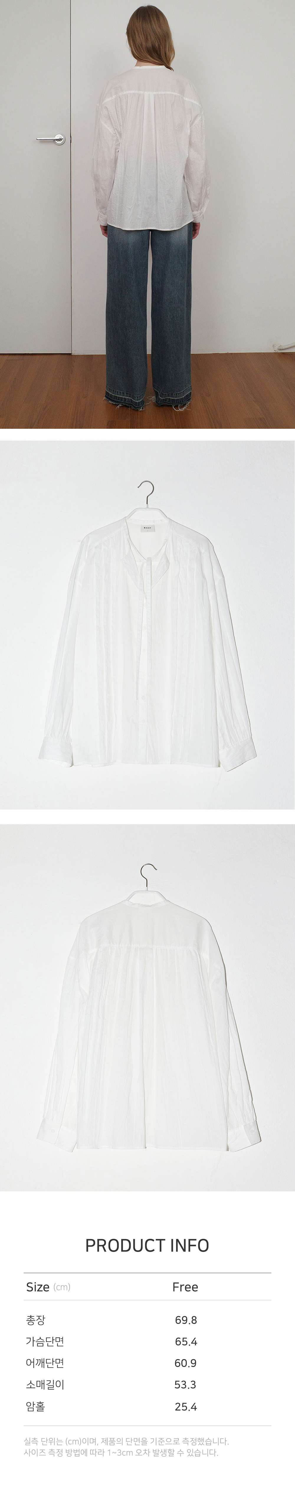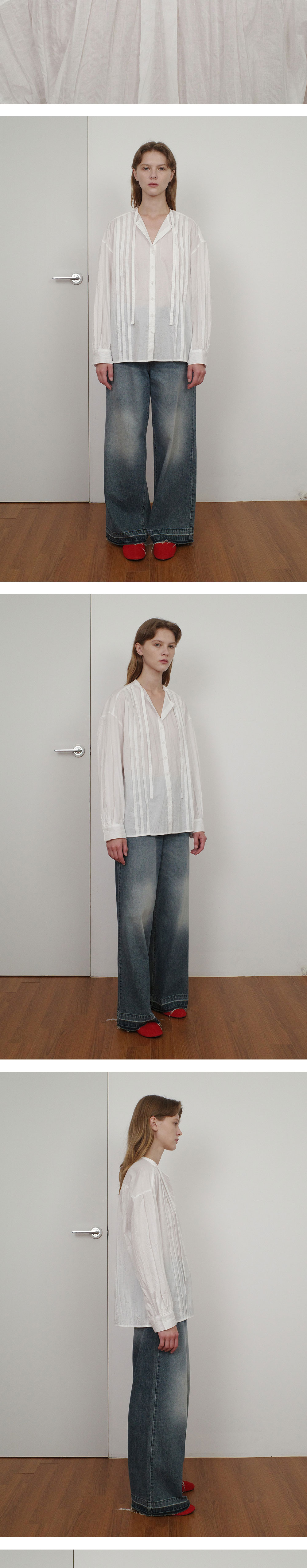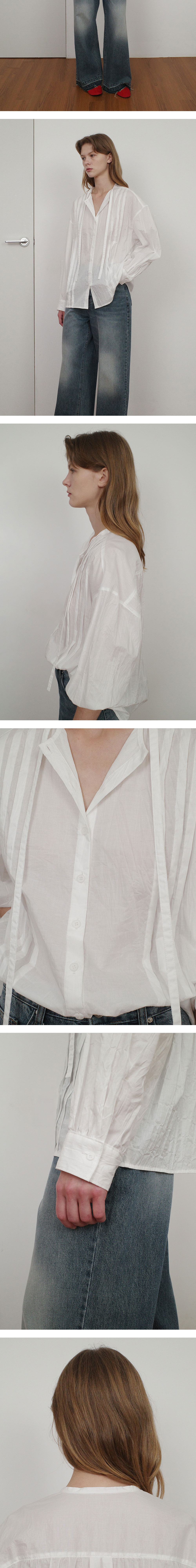 -주름이 매력적인 페미닌한 셔링 타이 블라우스입니다. -코튼 100 원단에 크리즈 가공을 거쳐 자연스러운 주름 효과를 더하여 다림질이 필요 없으며, 손쉽게 관리할 수 있도록 실용성을 높였습니다. -넥단에서 연장되는 제원단 끈으로 스카프처럼 연출 가능하며, 앞판에 핀턱과 뒷요크 아래 셔링 디테일이 매력적인 디자인입니다.