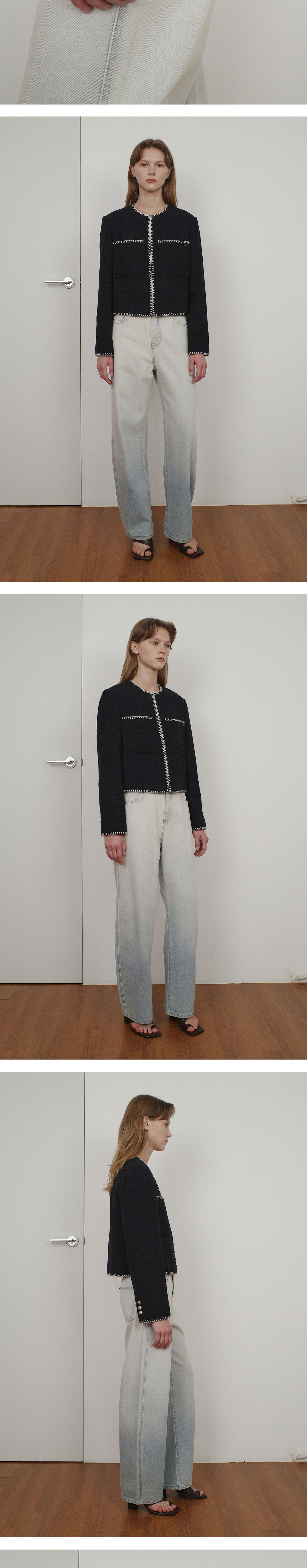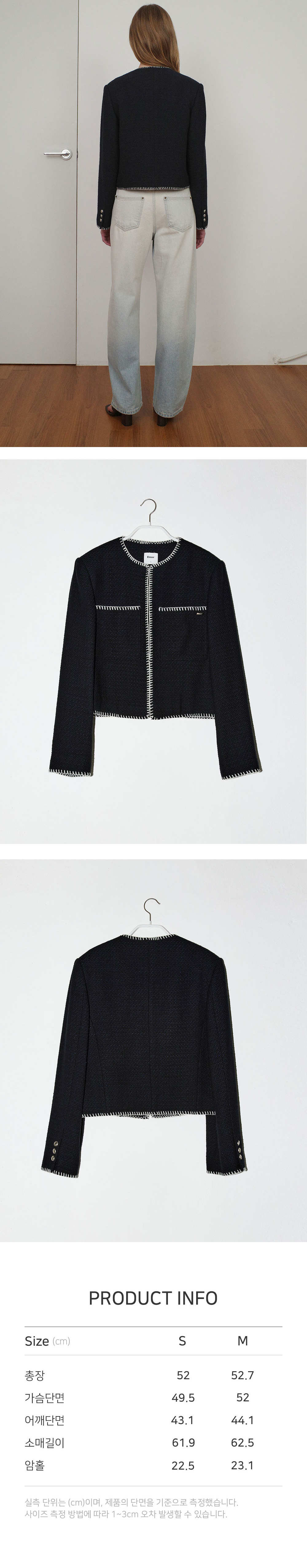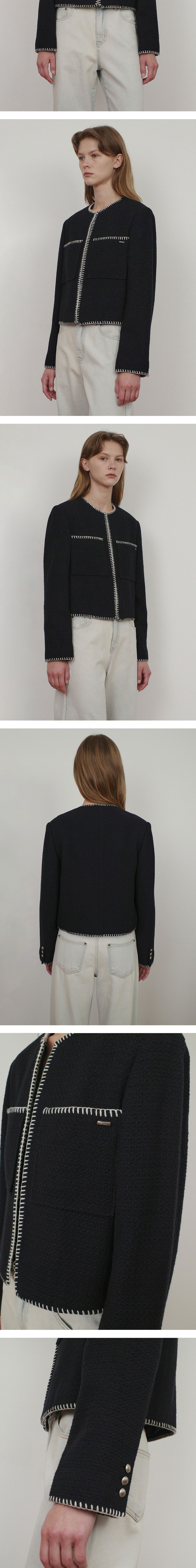 - 은은한 조직감이 돋보이는 라운드넥 울 혼방 트위드 자켓입니다. - 앞 단작 걸고리 여밈 디자인으로 깔끔하고 세련된 느낌을 주며, 착용 시 좌측 주머니에 엔오르 금속 라벨 포인트를 더해 고급스러운 완성도를 높였습니다. - 넥부터 앞단작, 밑단, 그리고 소매단까지 배색 멜로 스티치 자수 포인트를 더해 세련된 무드를 선사합니다.