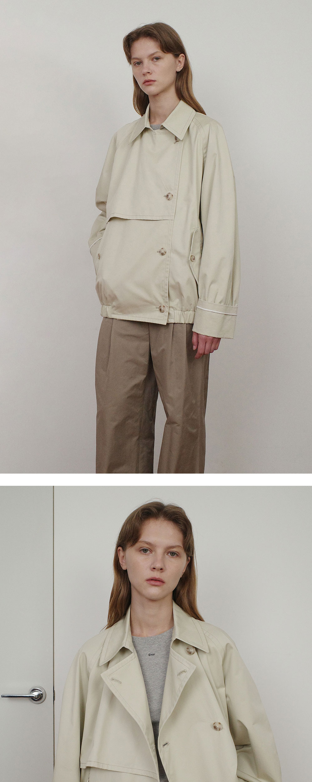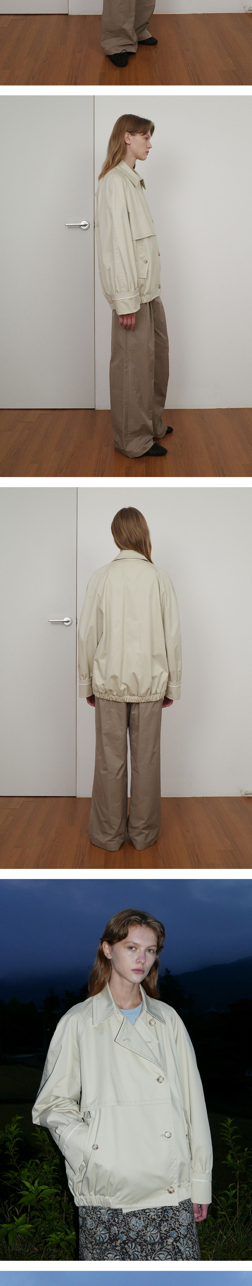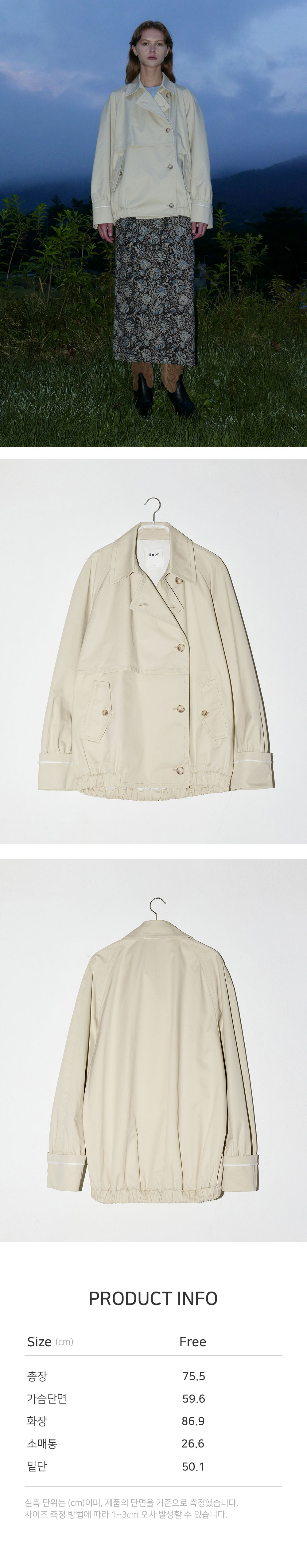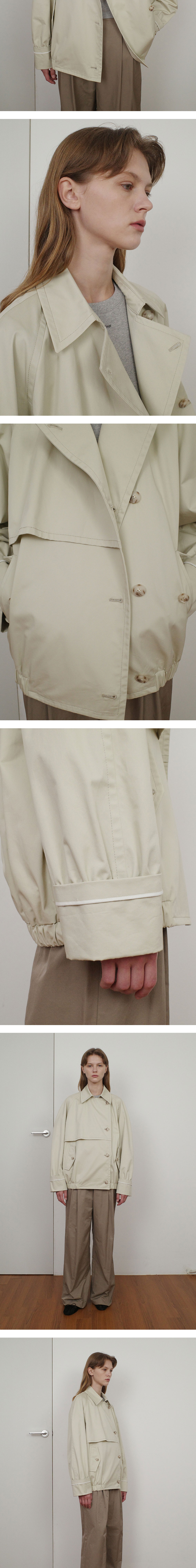 - 중힙 기장의 더블 버튼 미들 트렌치 점퍼입니다. - 코튼트윌 소재로, 은은한 광택감과 부드러운 터치감을 선사합니다. - 레글런 소매로 움직임의 불편함을 최소화했으며 활동적인 상황에서도 편안하게 착용이 가능합니다. - 앞가슴에 플라켓을 추가하여 세련미를 더하였고, 실사용 가능한 후다 포켓으로 실용성과 스타일을 동시에 갖추었습니다. - 카브라 소매에 배색 해리로 디테일 포인트를 주었고, 소매 위에 셔링 디테일을 추가하여 풍성하고 입체감 있는 소매 라인을 선사합니다. - 스탠 카라로도 착용 가능하여 다양한 실루엣 연출이 가능합니다.