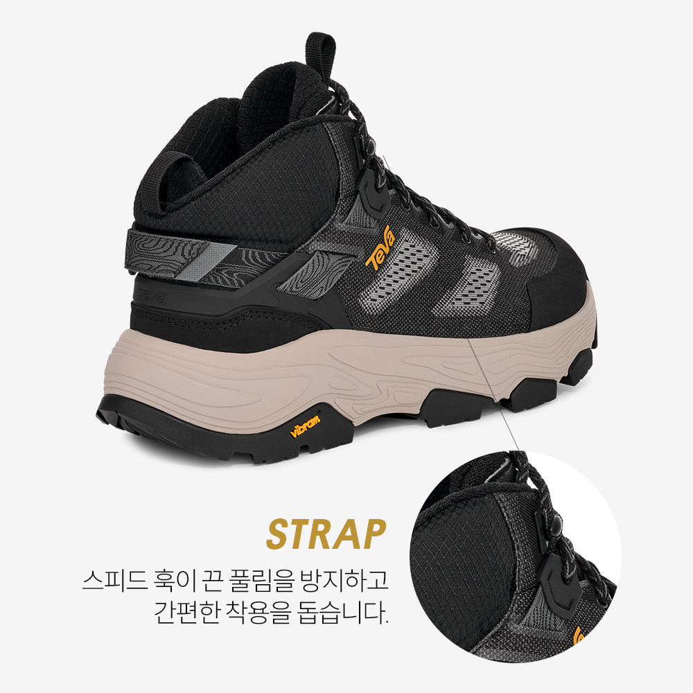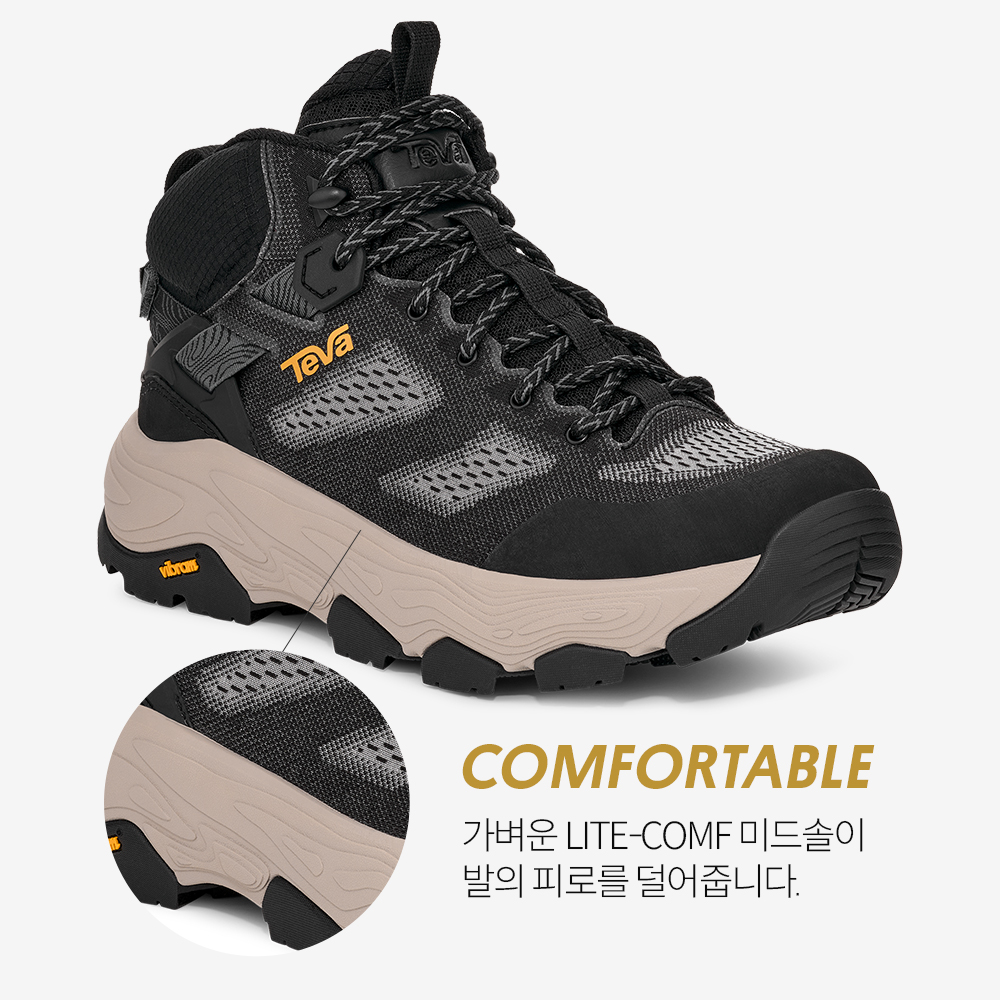더 쾌적하고 견고해진 테바의 새로운 등산화 그랜드뷰 맥스 벤트입니다. 특허받은 UHLS잠금 시스템으로 내리막길에서 안정감 있는 착용감을 구현했습니다. 가벼운 LITE-COMF 미드솔이 발의 피로를 덜어내고, 통기성좋은 모노 메쉬 소재가 쾌적함을 유지합니다. 편안하게 이어지는 산행에서 비브람 메가 그립 아웃솔의 놀라운 견인력도 함께 느껴보세요.