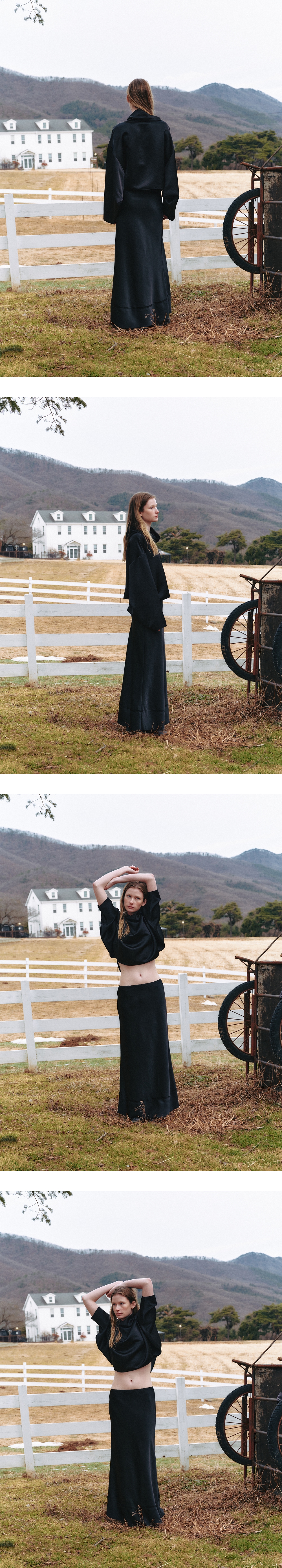 바이어스 재단이 된 맥시한 기장감의 새틴 스커트입니다. 세미 A 라인의 실루엣으로 여성스러움을 강조하였고 허리밴드에 레이스 디테일을 넣어 포인트를 주었습니다. 밑단에 절개 디테일을 추가하여 빈티지한 무드를 더하였습니다. LEAF SATINE BLOUSE 셋업으로 활용도가 높은 아이 템입니다.
