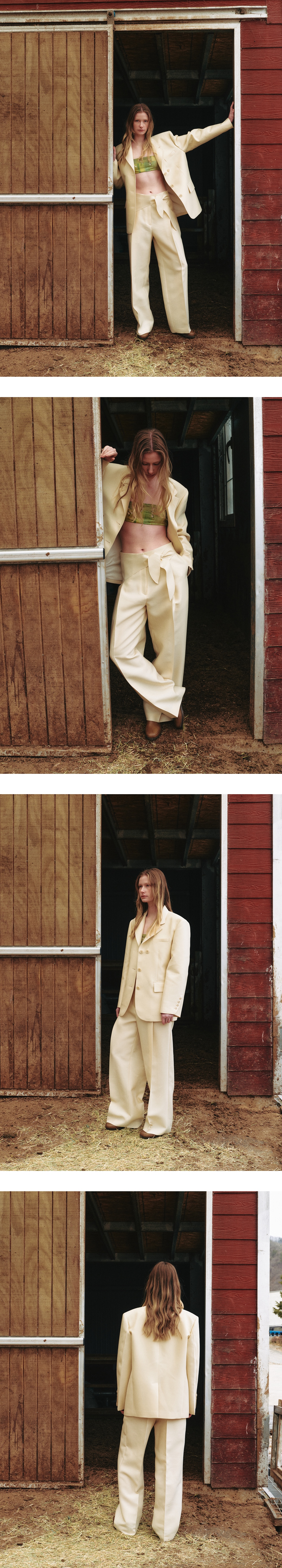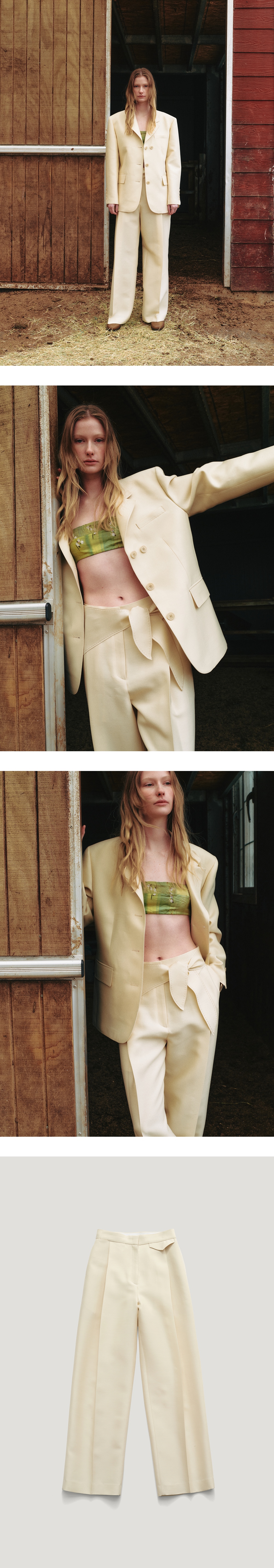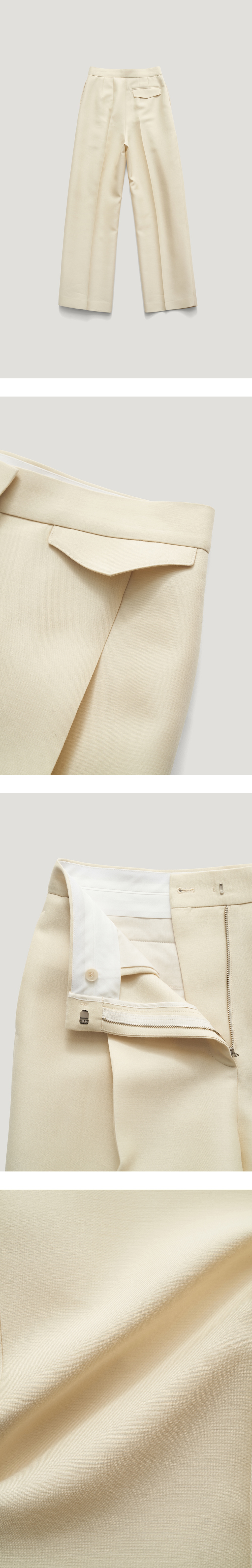 실크 특유의 고급스러운 광택감이 돋보이는 클래식한 무드의 울, 실크 혼방 팬츠입니다. 과하지 않은 세미-오버핏과 핀턱 디테일로 실루엣을 살린 디자 인으로 편하게 착용 가능하며 활용도가 높습니다. 블랙에 가까운 네이비 컬 러의 단정함과 로고 각인된 소뿔 단추로 완성도를 높였습니다. 코인 포켓과 허리선에 파르벵만의 플랩포켓 디테일이 더해진 탄탄한 팬츠입니다. *Fabric & Care 원단에 직접 다림질 시 수축, 변형, 변색의 위험이 있으니 주의 부탁드립니다.