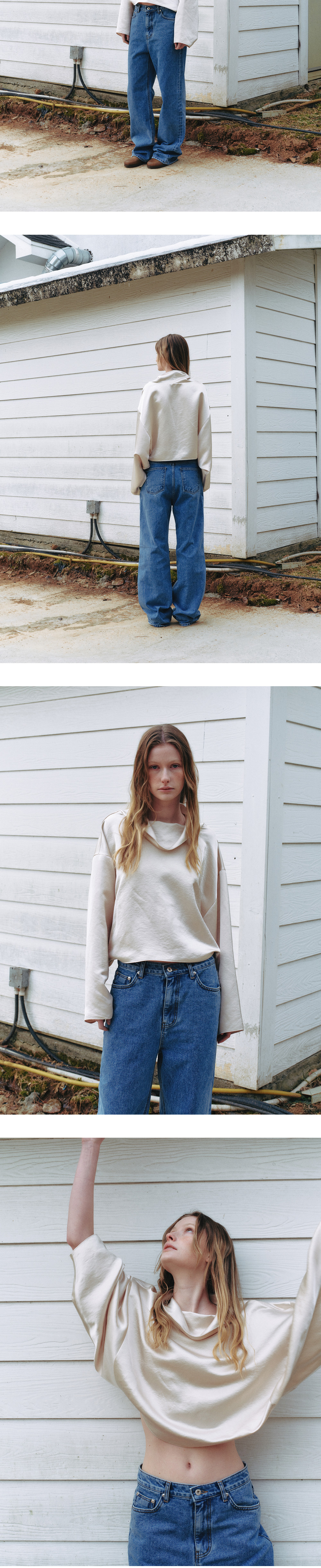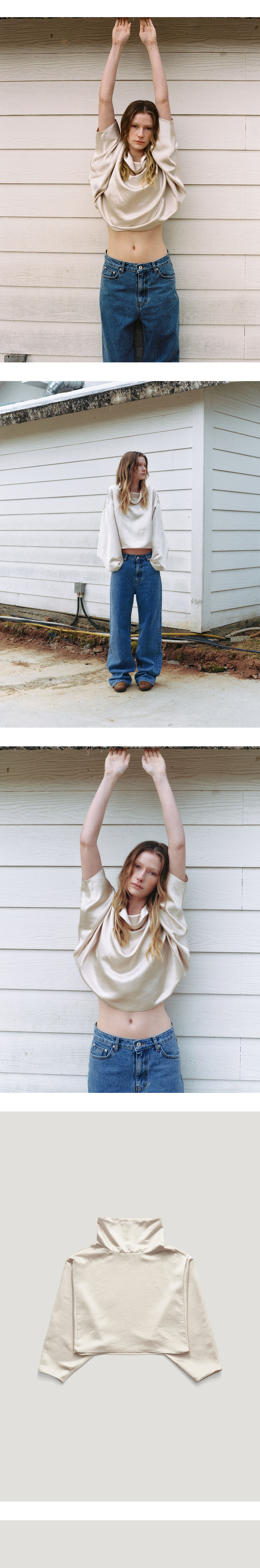 소프트한 폴리에스테르 소재를 사용한 유연한 텍스처의 새틴 블라우스입니 다. 생활 주름에 강하며 넉넉한 넥 라인의 풀오버 형태로 릴렉스한 핏감과 편안하게 착용이 가능한 블라우스입니다. 암홀 라인 없이 감싸는 형식으로 다양하게 활용 가능합니다. LEAF SATINE SKIRT 제품과 셋업으로 착용 이 가능합니다.