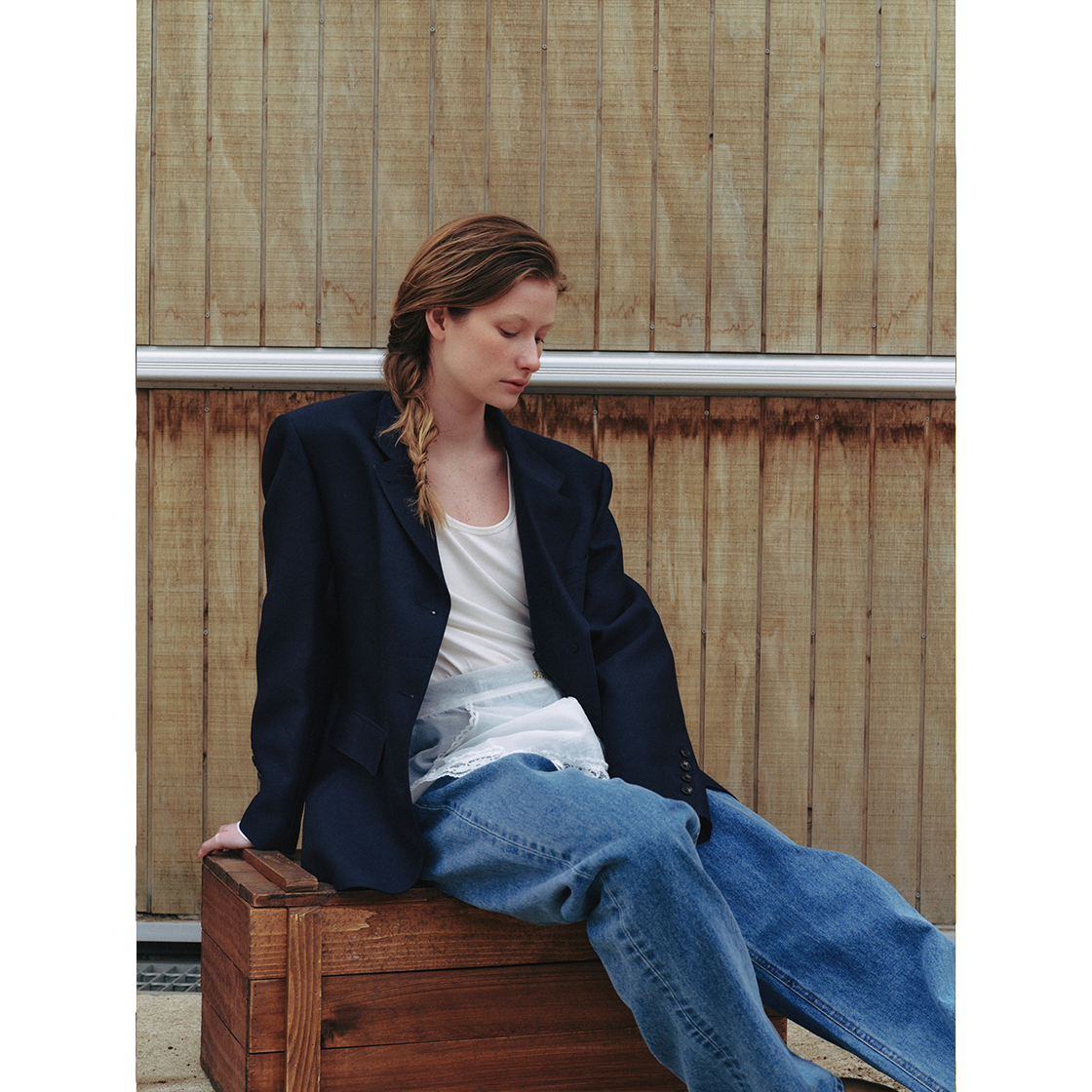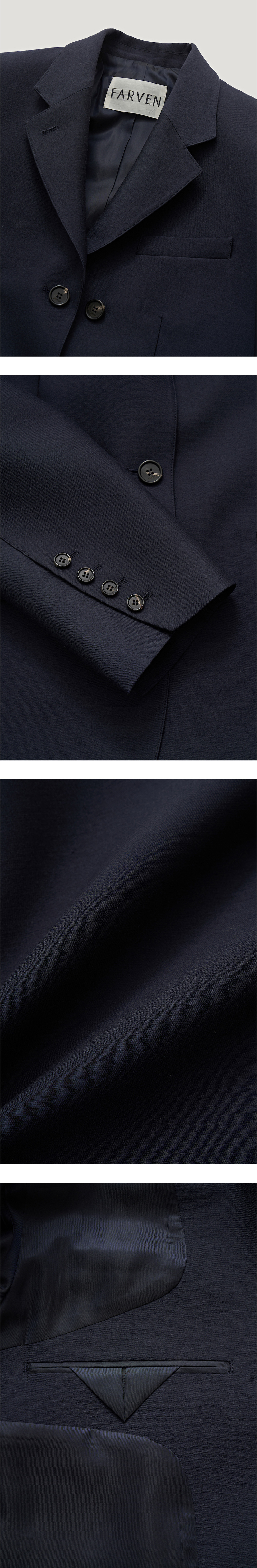 실크 특유의 고급스러운 광택감이 돋보이는 클래식한 무드의 울, 실크 혼방 자켓입니다. 과하지 않은 세미-오버핏과 간결한 테일러드 카라 디테일에 숄더 패드를 _x0008_넣어 실루엣을 살린 디자인으로 활용도가 높습니다. 블랙에 가까운 네이비 컬러의 단정함과 로고 각인된 소뿔 단추로 완성도를 높였습 니다. 독특한 단추 배열, 뒤 소매 라인에 주름 디테일로 포인트를 주었습니다. *Fabric & Care 원단에 직접 다림질 시 수축, 변형, 변색의 위험이 있으니 주의 부탁드립니다.
