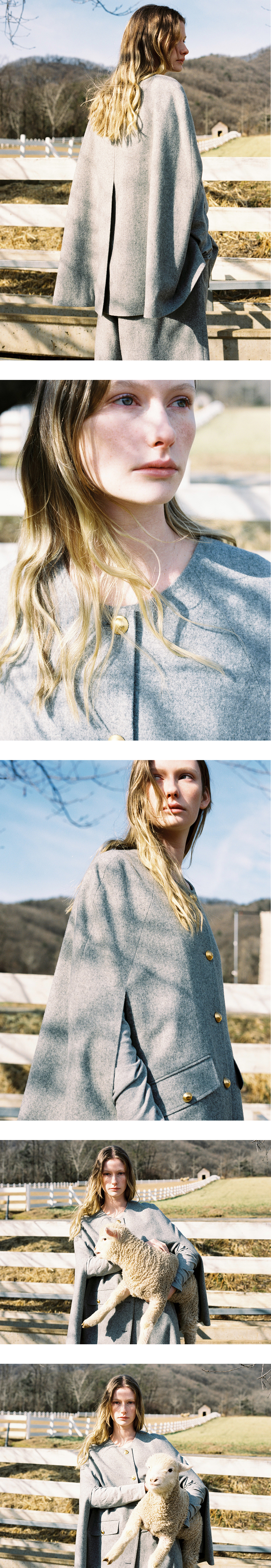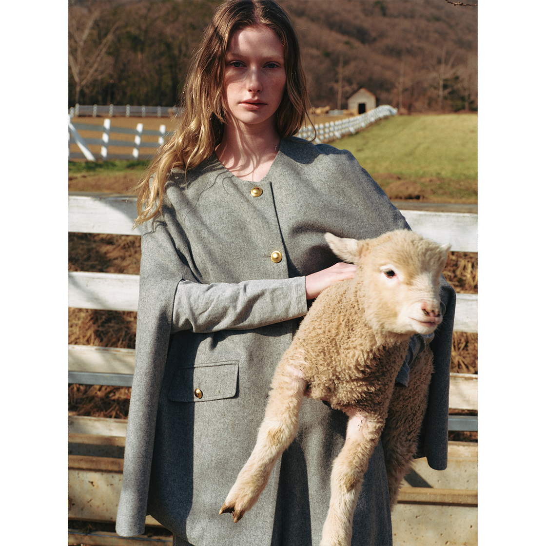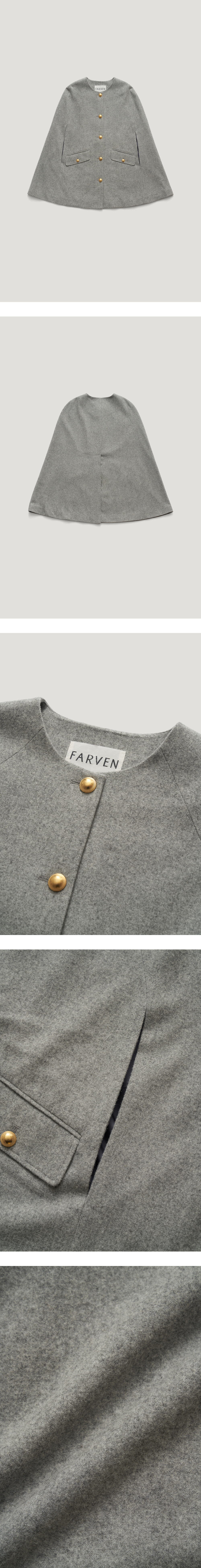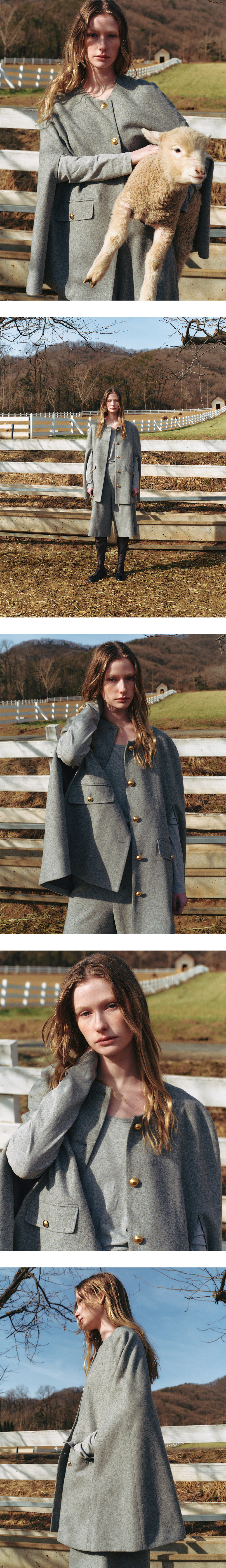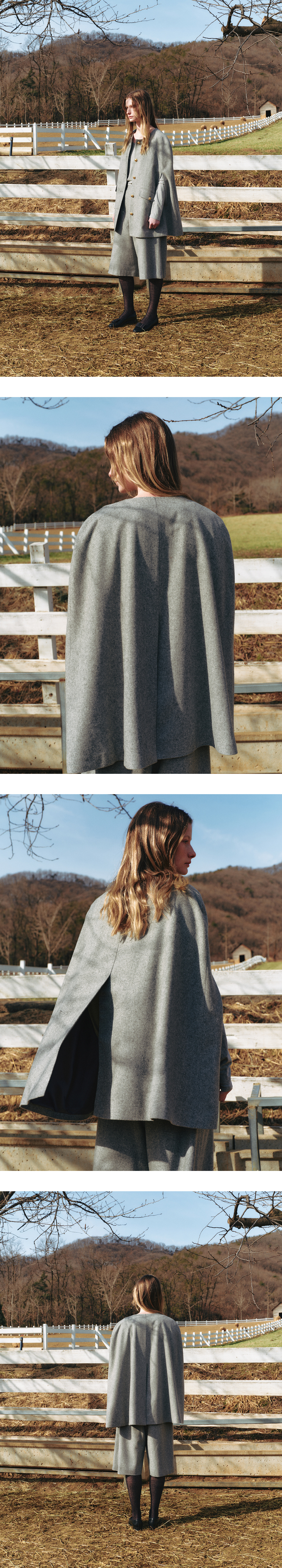 케이프 형식의 숏 기장 코트입니다. 간결한 디자인으로 숄더 라인이 유려하게 떨어지며 울과 폴리 혼방의 블렌디드 소재를 사용해 부드러운 터칭이 특징입 니다. 뒤 중심과 소매에 절개가 있어 편안하게 착용 가능하며 앞여밈에 고급스 러운 24K 골드 컬러의 버튼으로 오픈 클로징이 가능합니다. 가볍게 걸치기 좋은 아이템으로 다양한 이너와 함께 다양하게 연출 가능합니다. COTTAGE WOOL BERMUDA PANTS 제품과 셋업으로 착용이 가능합니다.