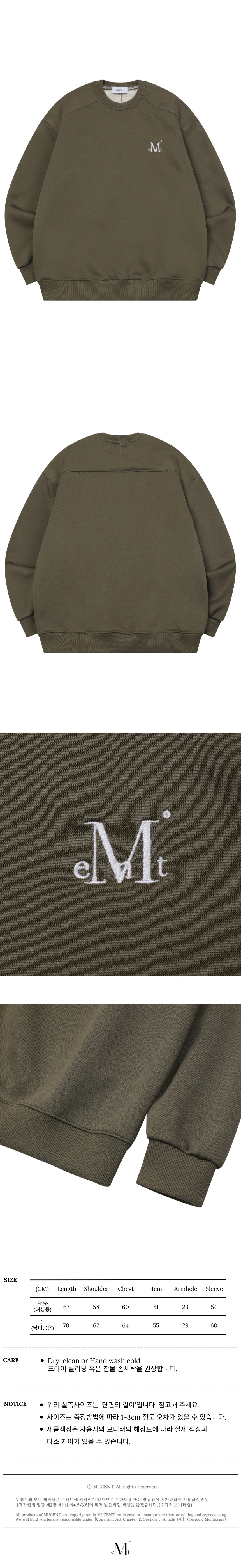 ┃Detail • 전면부 무센트 시그니처 로고 자수 • 탄탄한 소재감 • 약기모 안감으로 피부에 닿았을 때 부드러운 촉감 • 밑단 시보리로 완성도 높은 마감 • 루즈하게 떨어지는 드롭숄더 라인 • 봄 가을 겨울 3계절 모두 착용하기 좋은 두께감 ┃Material : Polyester 100% ┃Care : Dry cleaning - 무센트는 말기의 행성인 이 지구에서 지속 가능한 옷들을 고민합니다. 우리는 신념을 소비하는 미닝아웃을 지지합니다.