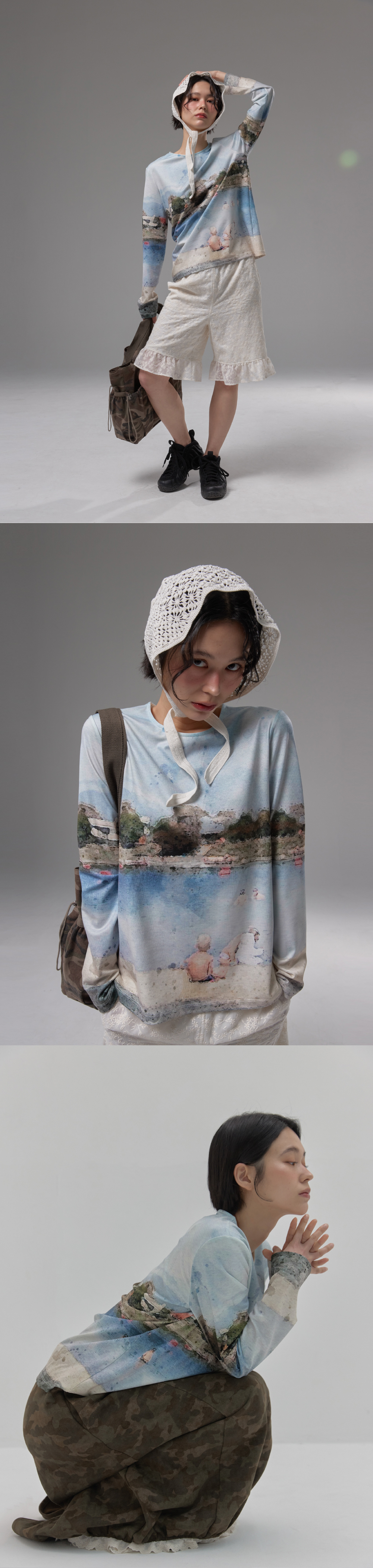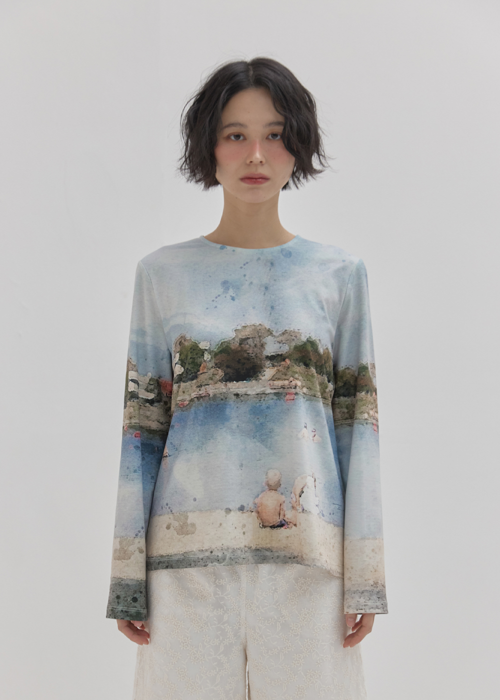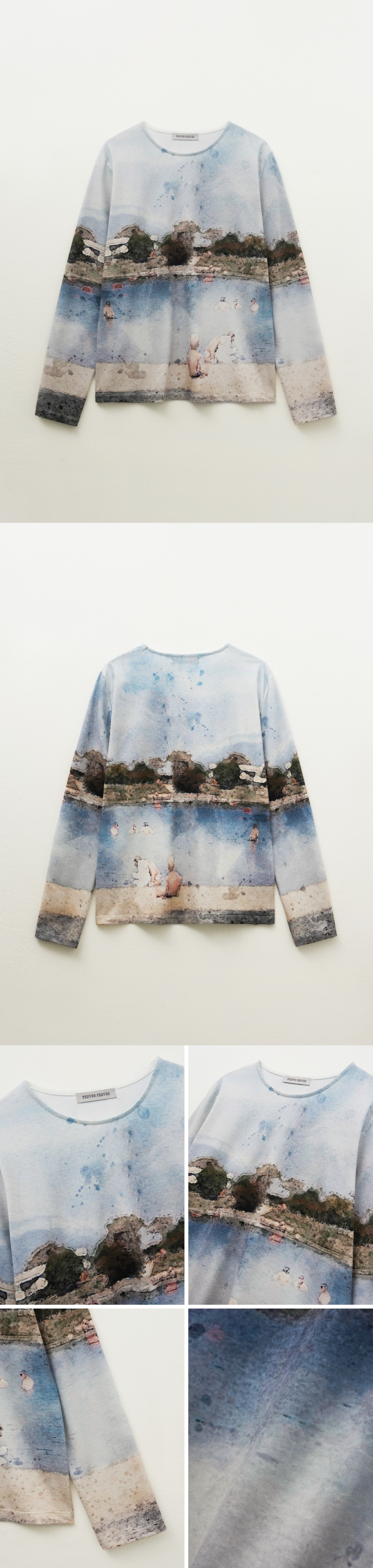 - 24년 여름, 오스트리아 빈의 Alte Donau 에서 찍은 사진을 수채화 방식으로 개발한 그래픽이 담긴 롱슬리브 티셔츠 - 전판 승화전사 프린트 - 레귤러핏 실루엣 - 우수한 신축성의 실키한 패브릭으로 편안한 착용감