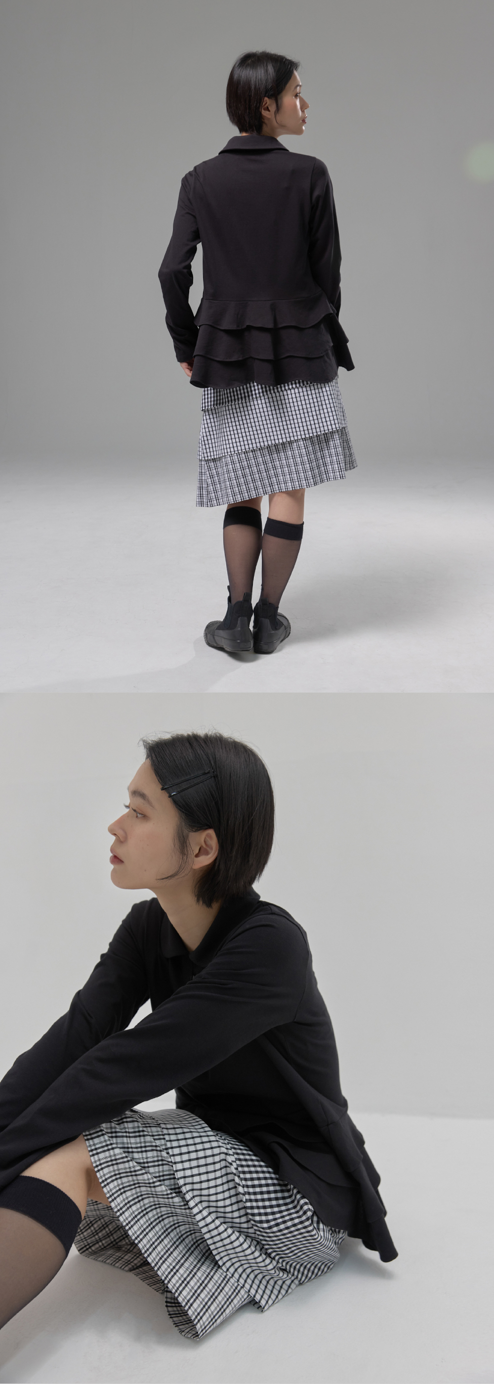 - 4단 티어드 미디움 기장 스커트 - 허리 여밈 버튼 3개로 사이즈 조절 가능 - 다양한 패턴 배색 사용