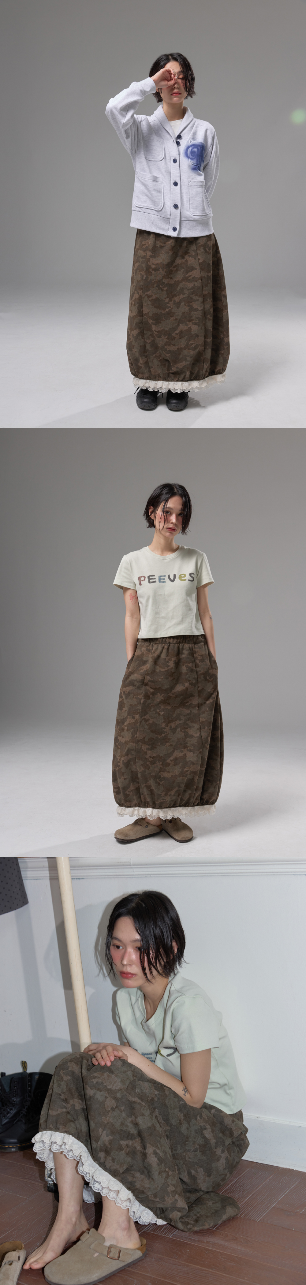 - 카모 패턴의 스웻 롱 스커트 - 벌룬 실루엣 - 허리 내부에 위치한 드로우 스트링 - 앞면 절개 디테일 - 사이드 슬릿 포켓 - 헴 이중 레이스 사용 - 후면 슬릿 디테일