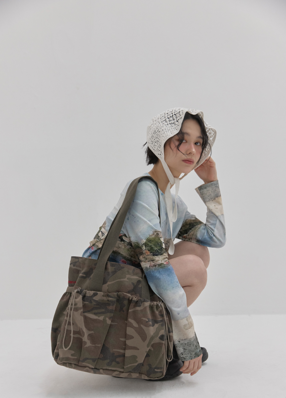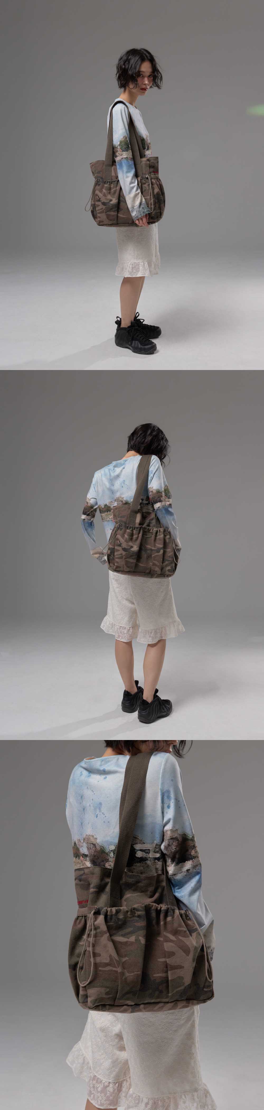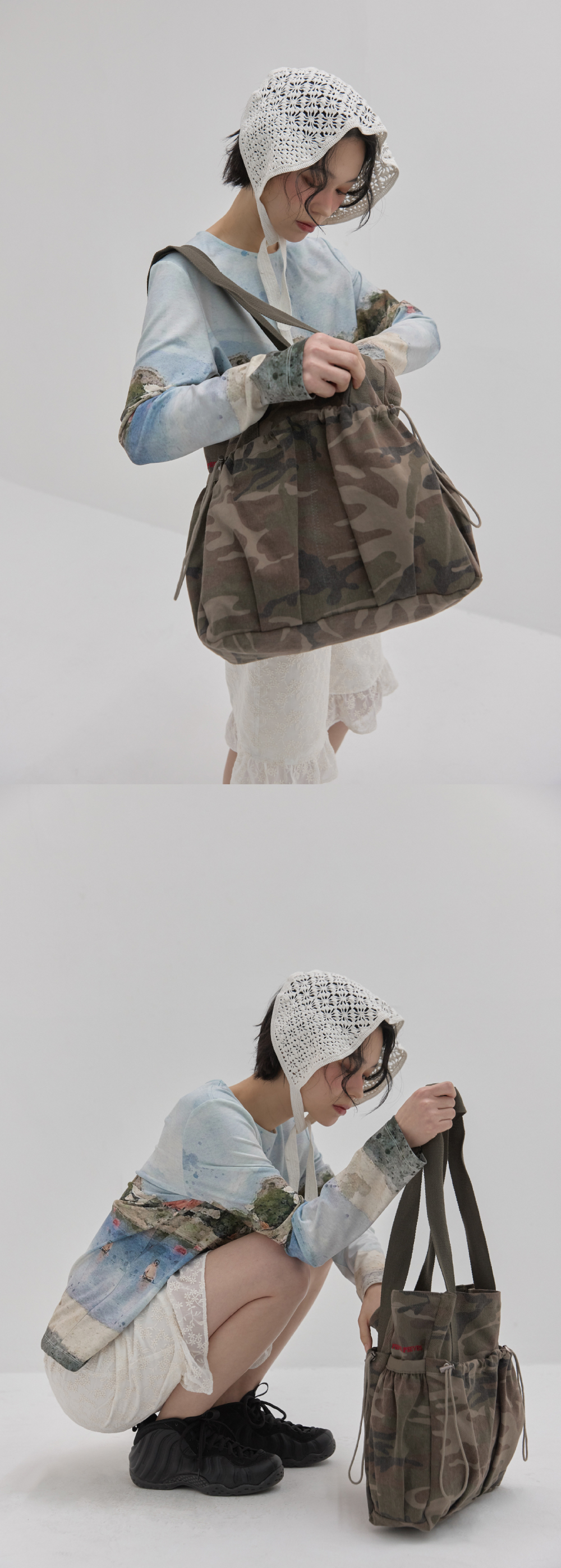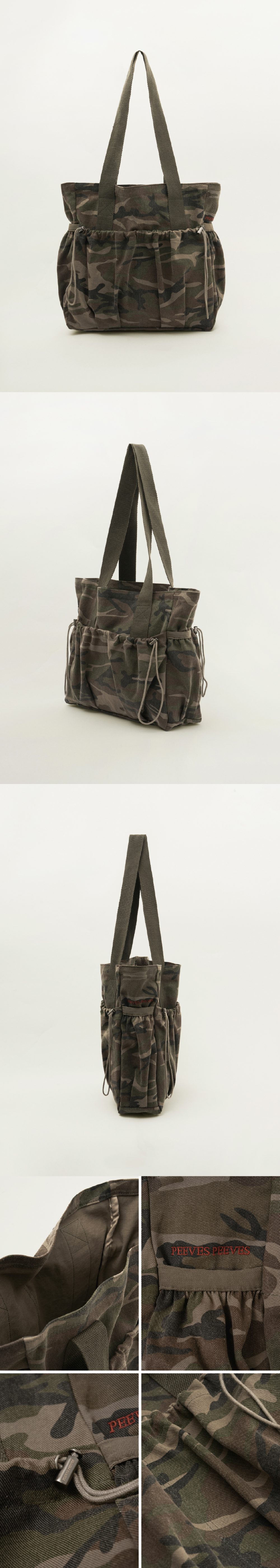 - 카모 패턴 캔버스 소재의 토드백 - 전후면 빅포켓 디자인 - 포켓 드로우 스트링 오픈 클로징 - 로고 각인된 금속 스토퍼 - 사이드 로고 자수 컬러 포인트 - 사이드 밴딩 클로징
