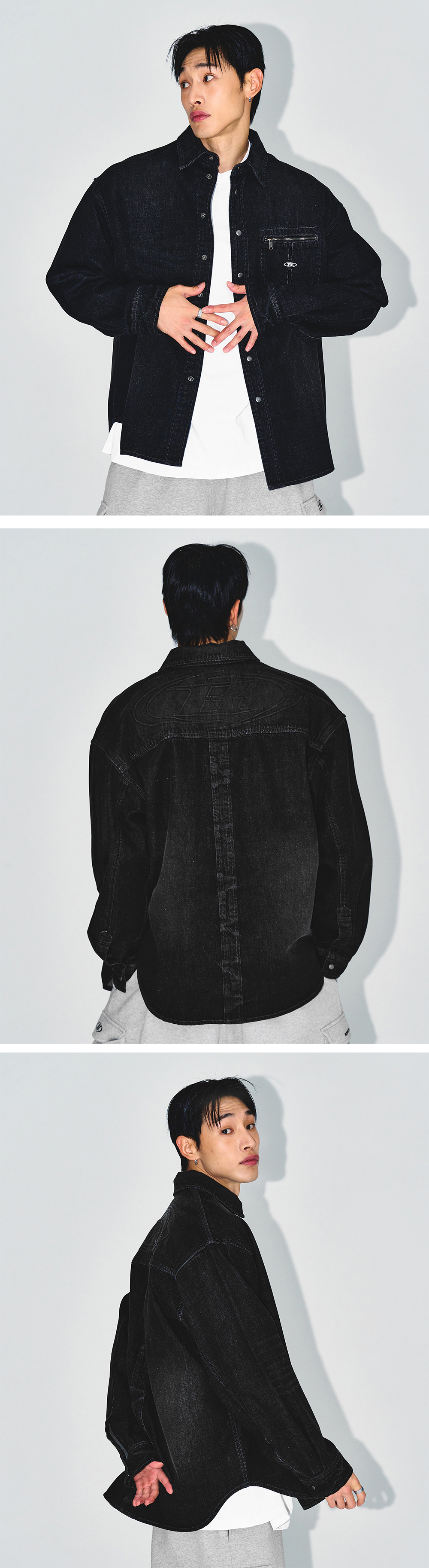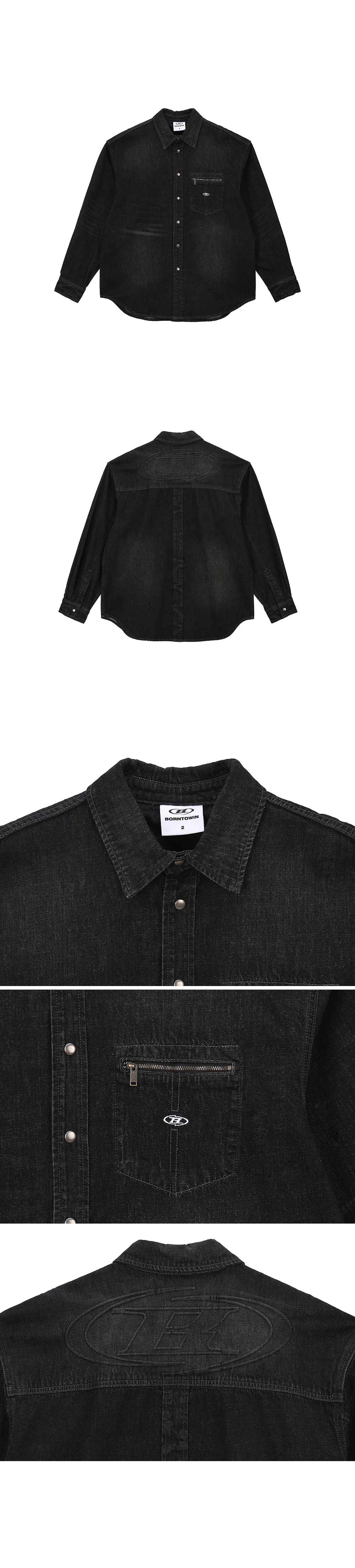 [DETAILS] * 워시드 데님 오버핏 셔츠 - 11oz 데님 - 빈티지 무드 워싱 - 심볼 로고 자수 포인트 - 후면 엠보 로고 포인트 - 지퍼 포켓 - 오버 사이즈핏 Material : Cotton 100% Fitting : TJ 1 Size, 172cm, 74kg