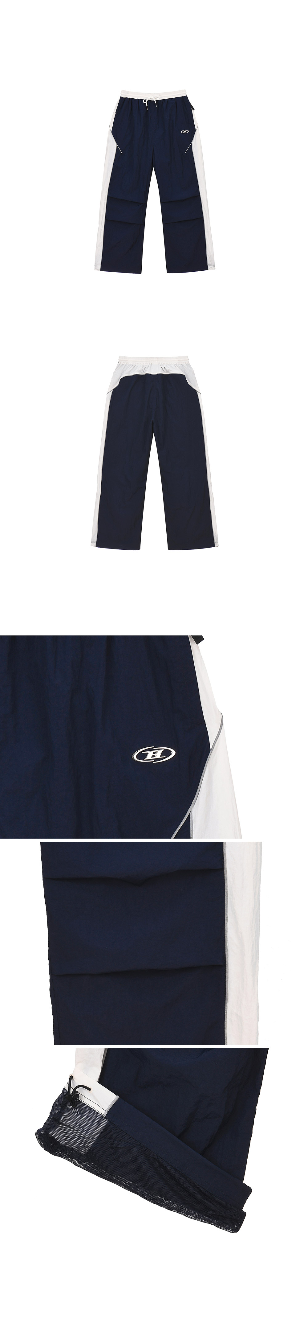 [DETAILS] * 나일론 블록 스트링 팬츠 - 방풍, 투습 기능 경량 나일론 원단 - 메쉬 안감 - 크롬 B 로고 포인트 - 배색 절개 디테일 - 리플렉티브 파이핑 디테일 - 밑단 조절 가능한 엘라스트링 - 세미 와이드핏 Material : Nylon 100% Fitting : MK 2 Size, 181cm, 71kg