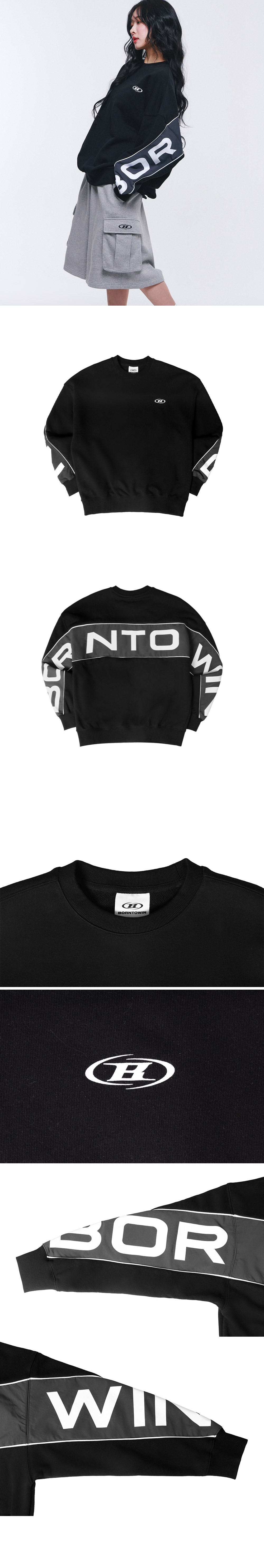 [DETAILS] * 나일론 믹스 볼드 스웻셔츠 - 탄탄한 코튼 혼방 원단 - 우븐 배색 레터링 포인트 - B 로고 포인트 - 오버 사이즈핏 Material : Cotton 60%, Polyester 40% Fitting : DJ 3 Size, 183cm, 88kg