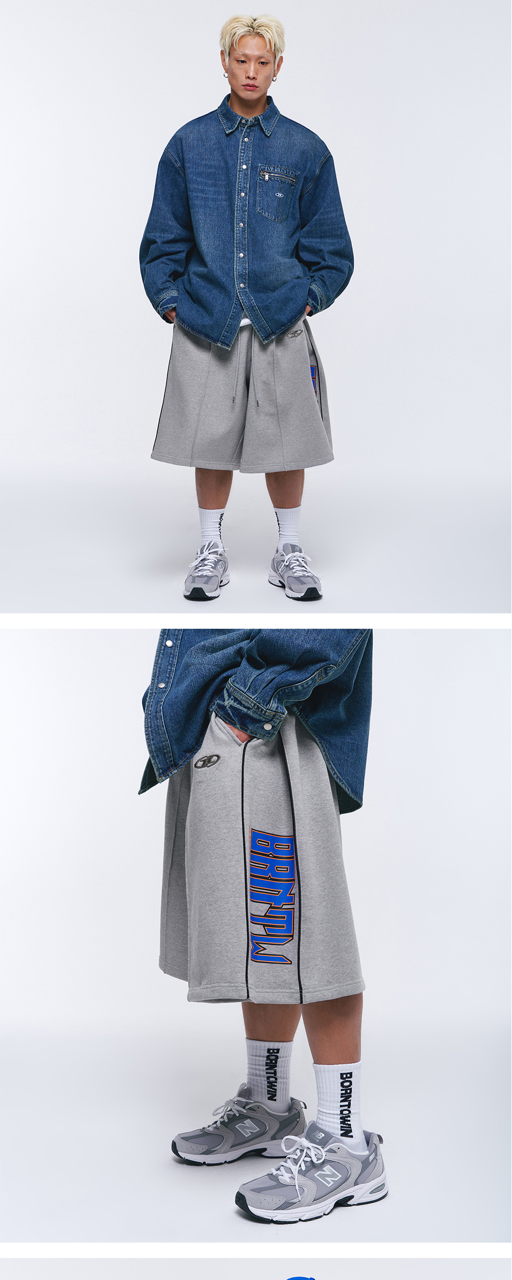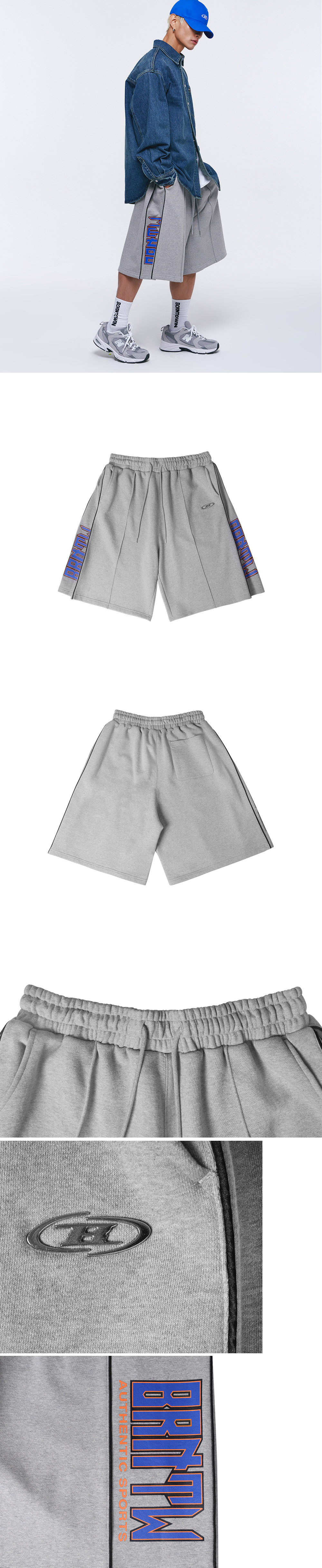 [DETAILS] * 사이드 투턱 버뮤다 팬츠 - 코튼폴리 헤비테리 원단 - 크롬 B 로고 포인트 - 투턱 플리츠 디테일 - 사이드 패널 레터링 포인트 - 6부 기장 버뮤다 쇼츠 Material : Cotton 60%, Polyester 40% Fitting : DS 1 Size, 178cm, 70kg
