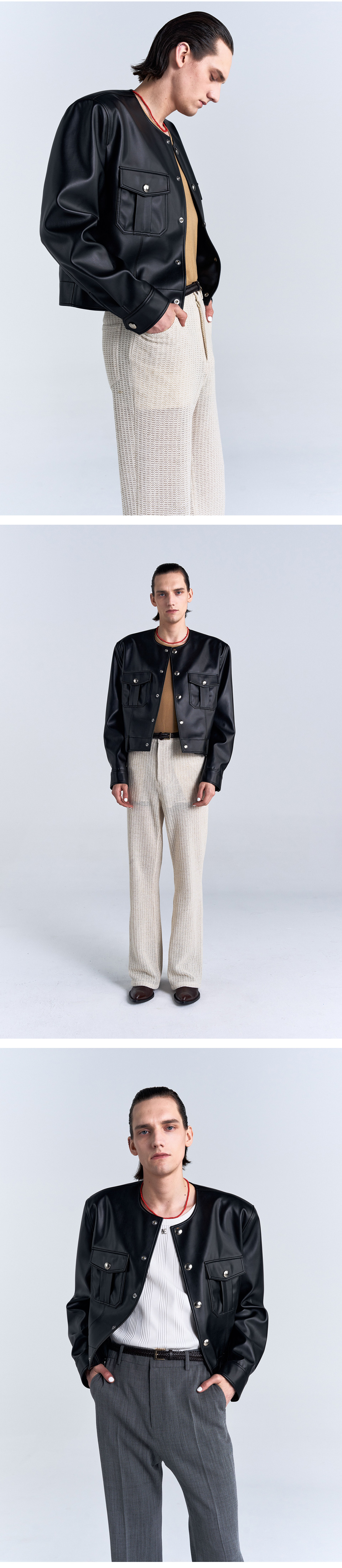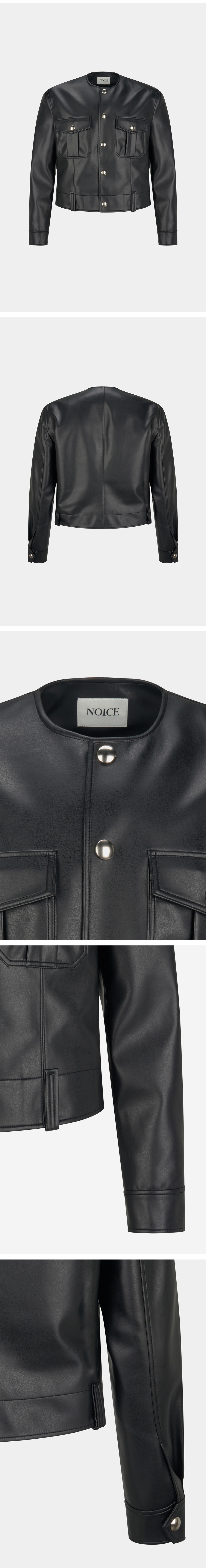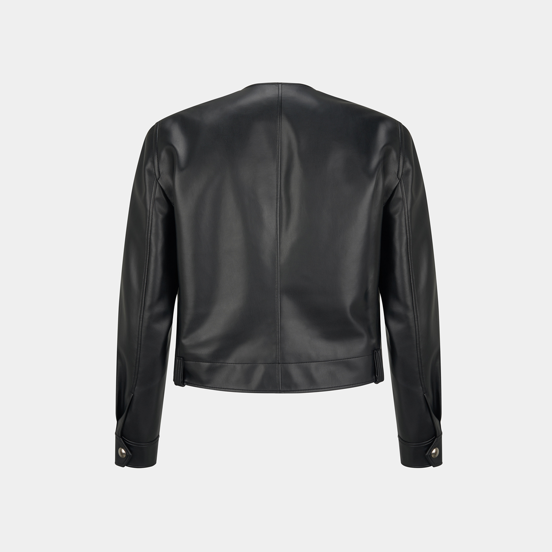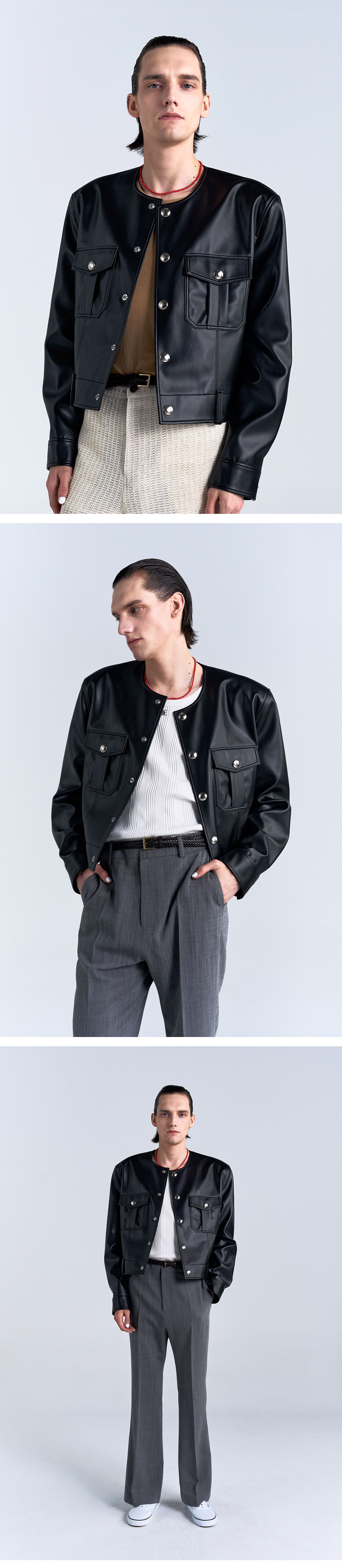 FAUX LEATHER 소재의 퓨어 카라 레더 자켓입니다. 밀리터리 디자인이 돋보이며, 크롭 기장과 구조적인 어깨 실루엣이 특징입니다.