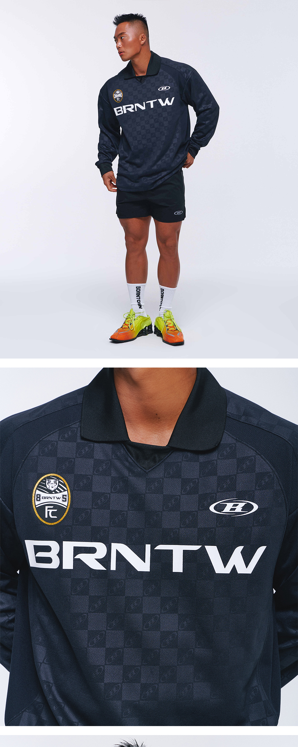 [DETAILS] * 모노그램 사커 저지 - 폴리 메쉬 원단 - 모노그램 로고 포인트 - 오픈 카라 디테일 - 스포티 엠블럼 그래픽 - 부위별 메쉬 절개 포인트 - 레귤러핏 Material : Polyester 100% Fitting : TJ 1 Size, 172cm, 74kg