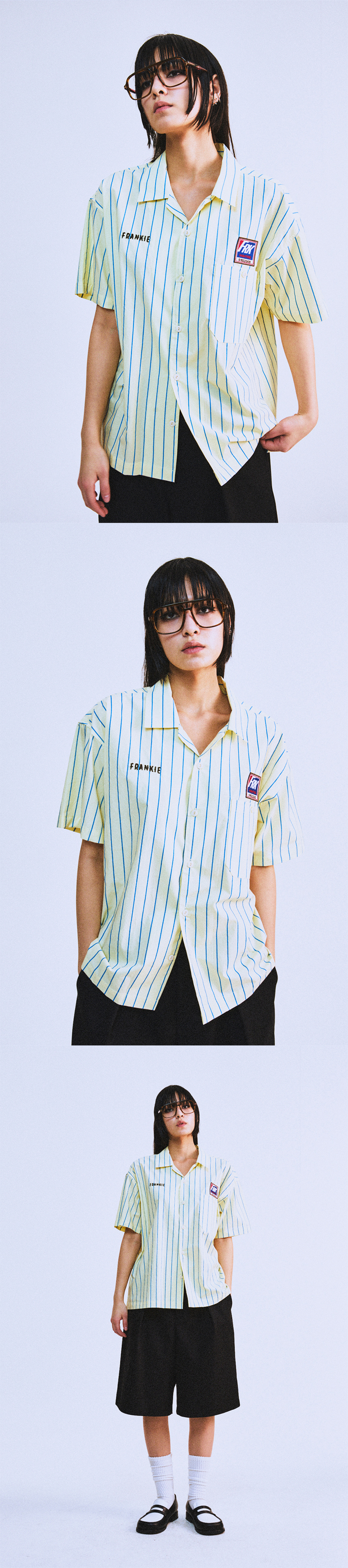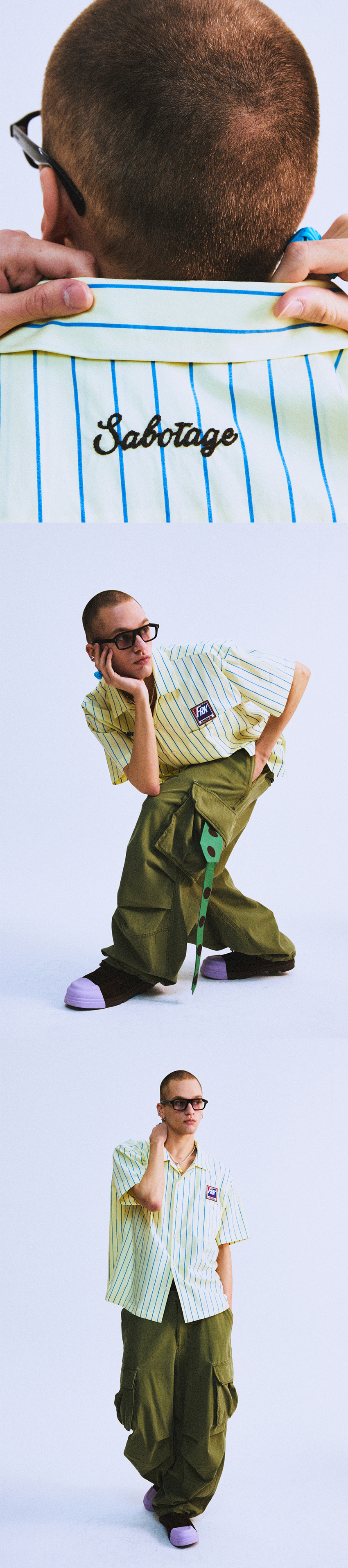 SIZE : M L M 어깨 56cm 가슴 59cm 소매 21cm 기장 69cm L 어깨 58cm 가슴 61.5cm 소매 22cm 기장 70cm 사이즈 측정은 재는 방법과 위치에 따라 1~3cm 오차가 발생할수 있음 Coisheam : 183cm 63kg Munira : 177cm 61kg 트럭 운전사들의 작업복에 영감받아 제작된 반팔 셔츠 입니다 은은한 바탕 컬러위 스트라이프 패턴이 배색된 원단 위 패치로 제작된 프랭키 아트웍과 체인 자수로 작업된 FRANKIE 를 양쪽에 배치하여 작업복 느낌을 더했으며 뒷면 중앙엔 SABOTAGE 를 체인 자수로 작업하였습니다 -혼용률- 면 100% / 바이오 워싱 -주의- 드라이 권장 옷을 뒤집어 미지근한 물에 세탁 표백제나 강력한 세제 사용 금지 건조기 사용 금지 자수 부분 다림질 금지 Made in KOREA