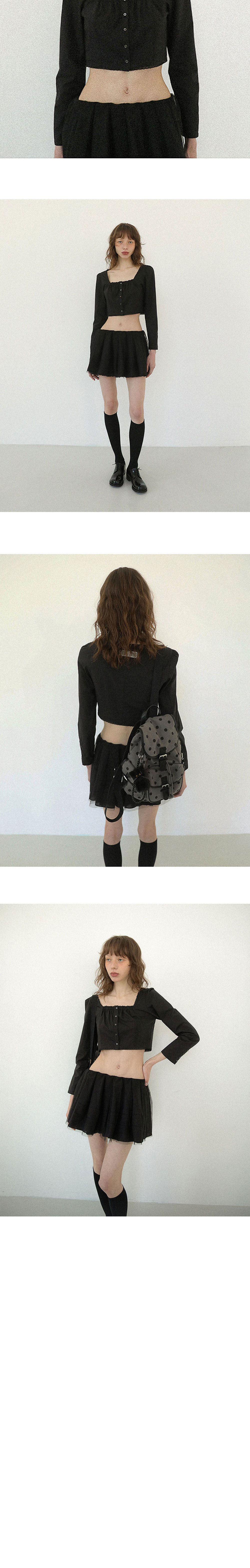 - 크롭기장의 스퀘어넥 블라우스 - 코튼 레이온 혼방의 구김이 적고 부드러운 소재 사용 - 네크와 밑단 레이스 포인트 - 소매 트임 디테일 - 천연소재의 자개단추 사용