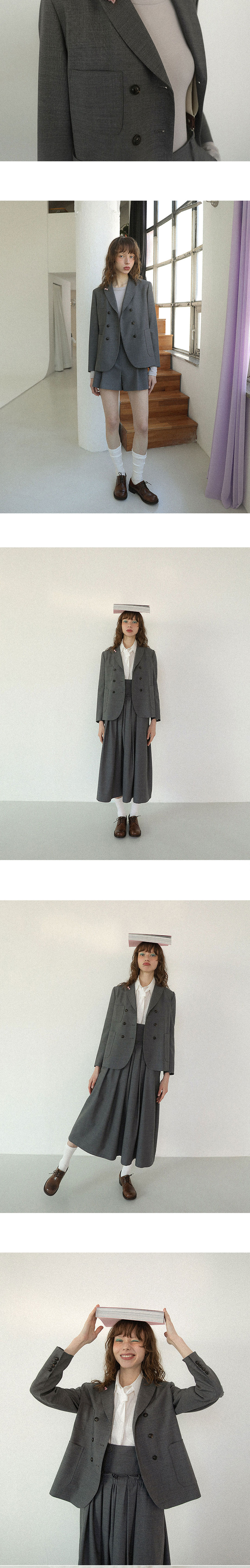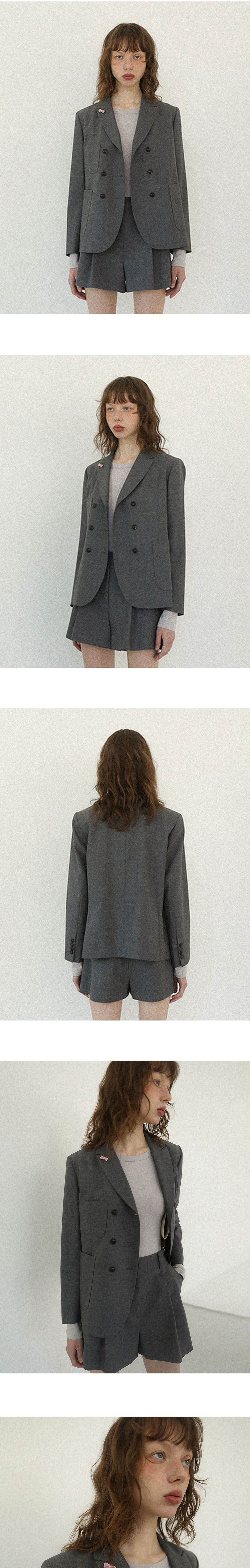 - 클래식한 무드의 더블버튼 디자인 자켓 - 광택이 적고 울 함량이 높은 고급 양장원단 사용 - 카라부분 탈부착 가능한 리본 단추 포인트 - 전면부 포켓으로 높은 실용성 - 적당한 기장감과 두께감으로 간절기에 착용 가능 - 핀턱쇼츠 및 오버롤 스커트와 셋업으로 연출 가능하며, 다양한 하의와 레이어드 가능