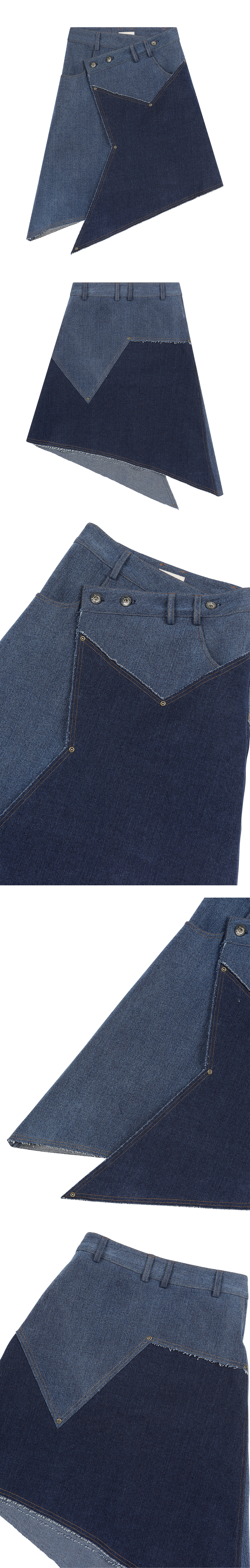 A라인 비대칭 데님 랩스커트 앞판 별모양 배색 데님 데끼 패치 캔톤단추를 이용한 사이즈 조절