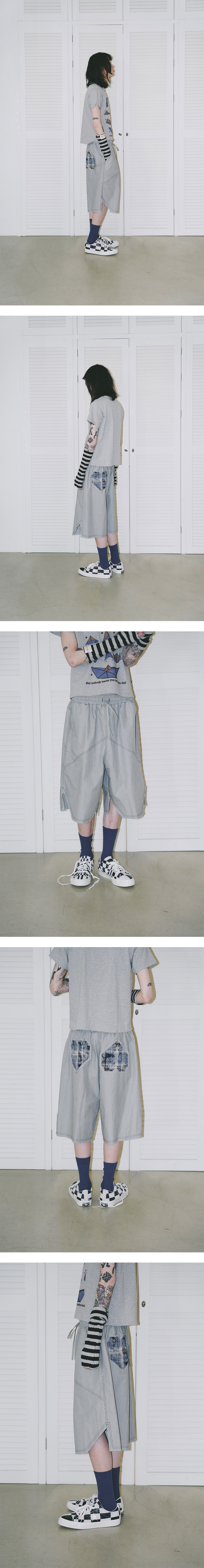 30수 피그먼트 바이오 원단 앞판,밑단 하트모양의 데끼 절개 디테일 뒷판 하트모양 데끼 더블패치워크 비대칭 포켓