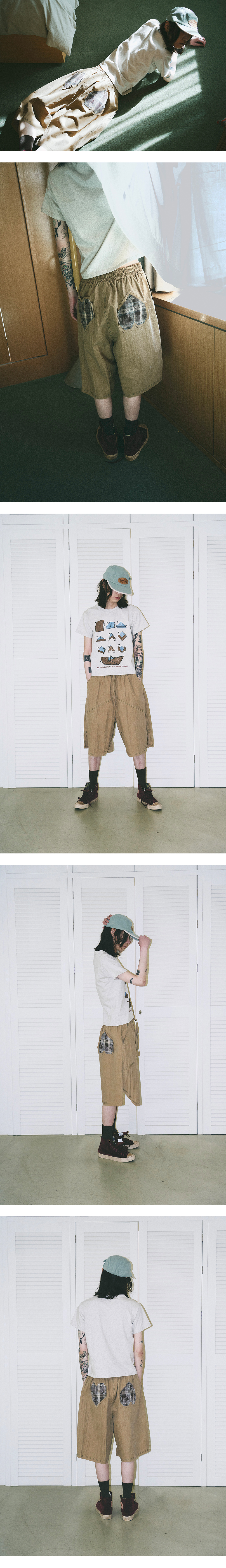 프라블럼올웨이즈 오프셋 하트 패치 빈티지 체크 쇼츠 베이지