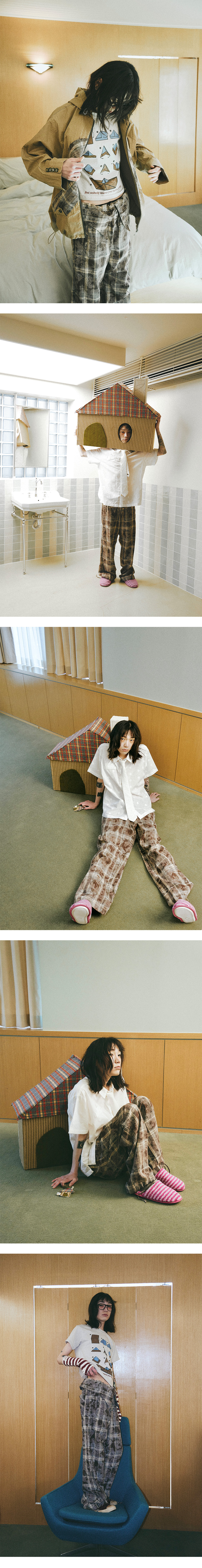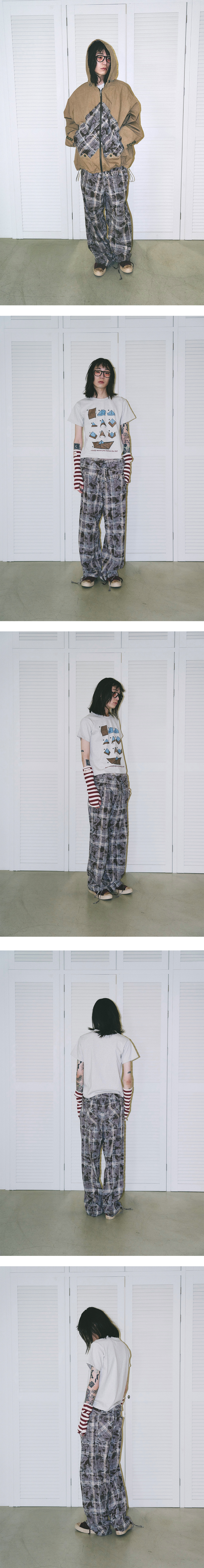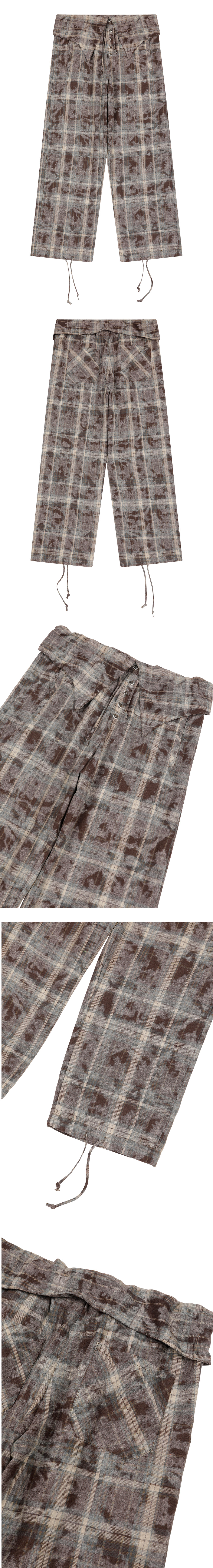 세미 와이드 핏 빈티지 체크셔츠 팬츠 허리 밴딩 부분 셔츠의 디자인을 응용한 칼라와 단추 디테일 밑단 부분 제원단 조임 스트링 뒤 포켓 바이어스 체크