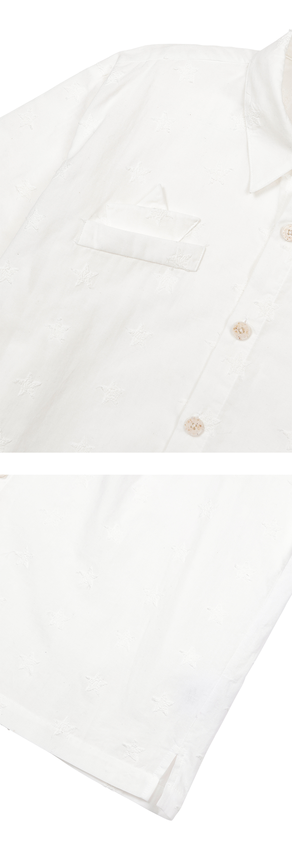 별모양이 비치는 원단의 오버 핏 반팔 셔츠 오른쪽 가슴부분 돛단배 행거치프 디테일 빈티지 단추 디테일