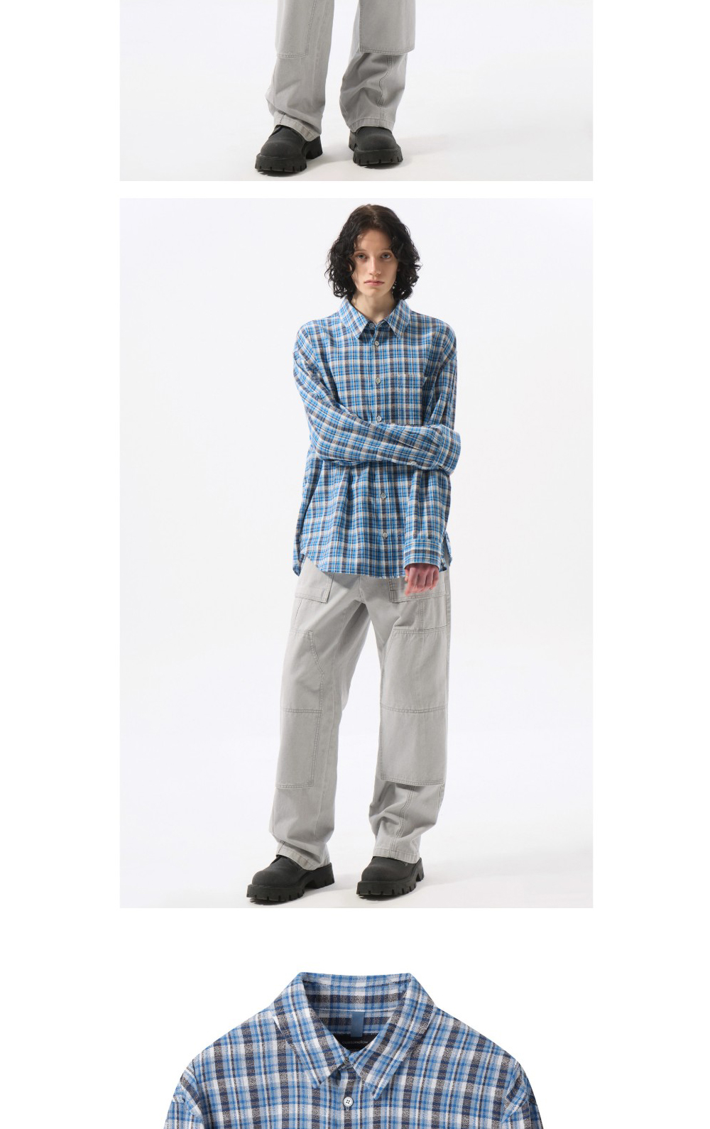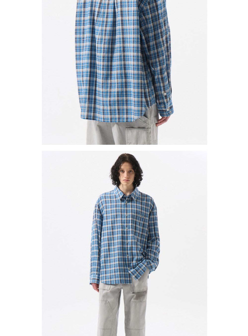 커스텀멜로우 2칼라 디테일 사이드 슬릿 셔츠 체크 블루