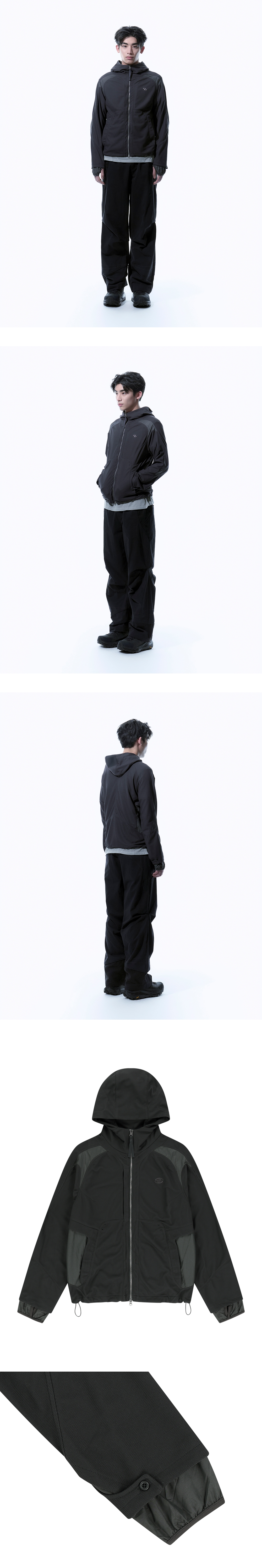 - 전면부 2WAY 지퍼 사용 - 실루엣 조절 가능한 후드 스트링 - 레이어 디테일의 소매 밑단
