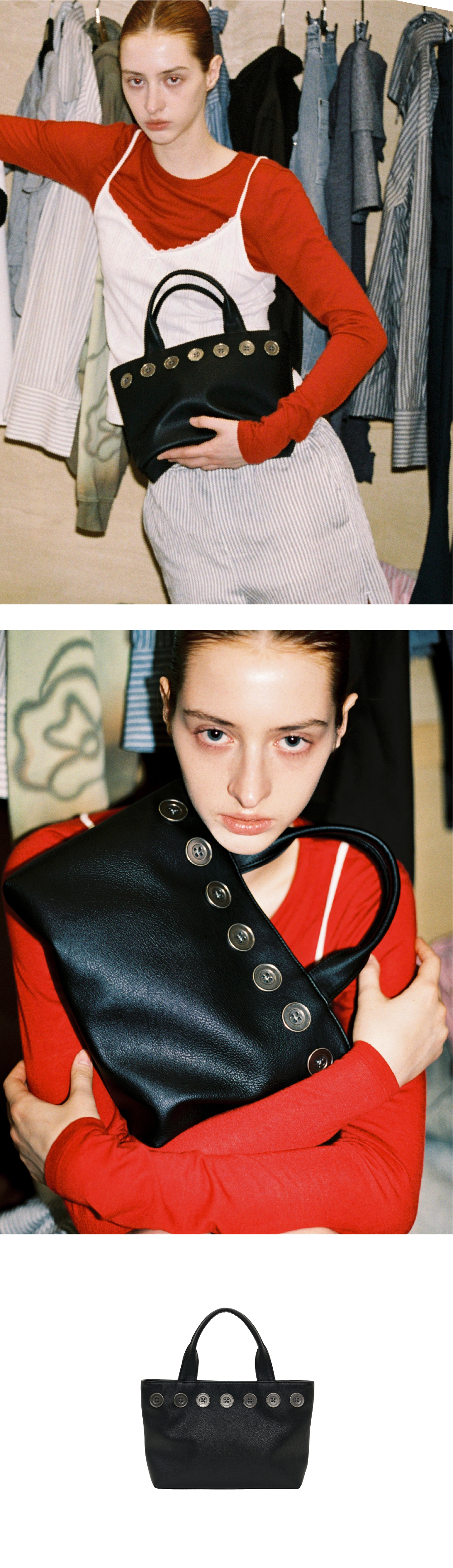 사용감 좋은 사이즈로 제작된 토트백 · 가볍고 은은한 무광 레더 소재 · 양면 빈티지 메탈 단추 장식 · 하단부 엘라스틱 씽 보강 작업으로 백 쉐입 유지 및 처짐 방지 · 내부 포켓과 가죽 로고 라벨