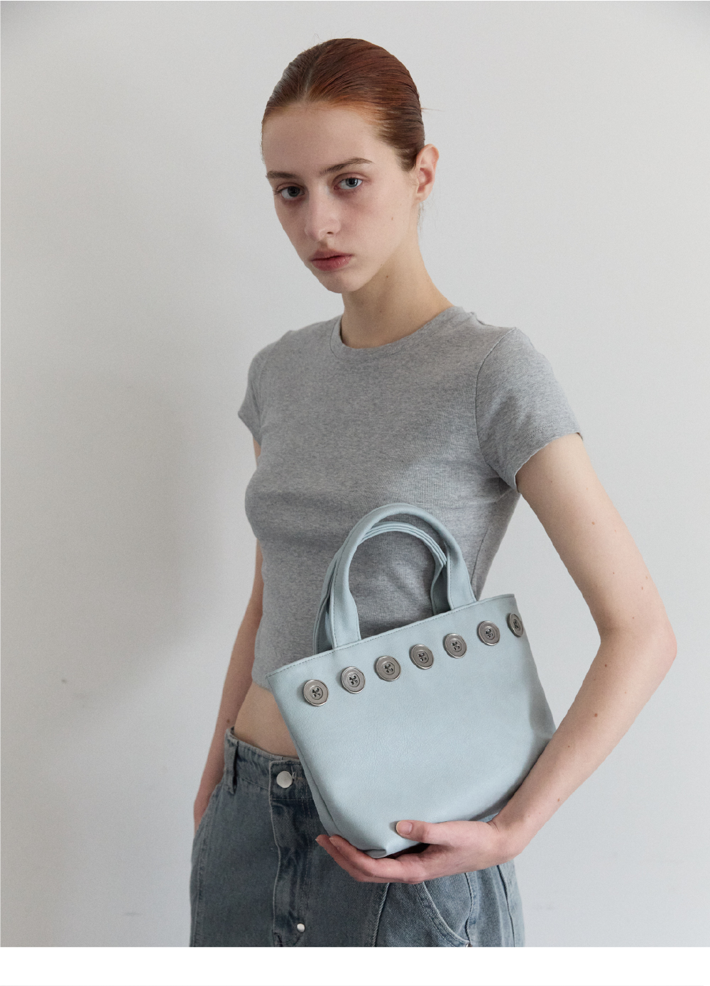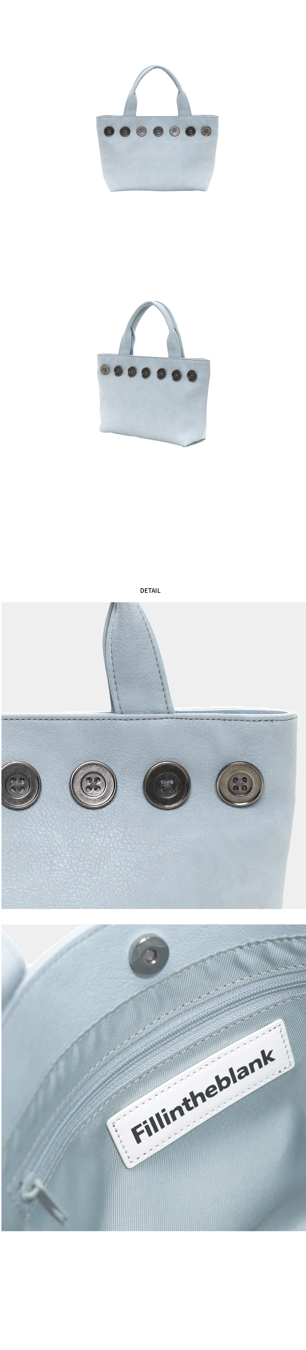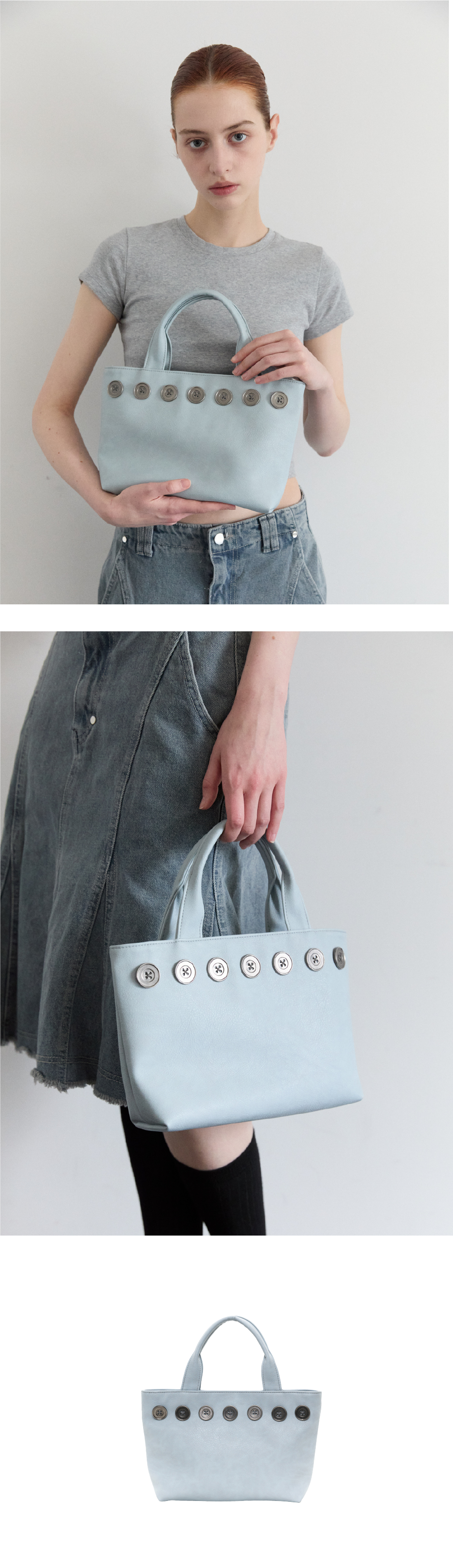 사용감 좋은 사이즈로 제작된 토트백 · 가볍고 은은한 무광 레더 소재 · 양면 빈티지 메탈 단추 장식 · 하단부 엘라스틱 씽 보강 작업으로 백 쉐입 유지 및 처짐 방지 · 내부 포켓과 가죽 로고 라벨