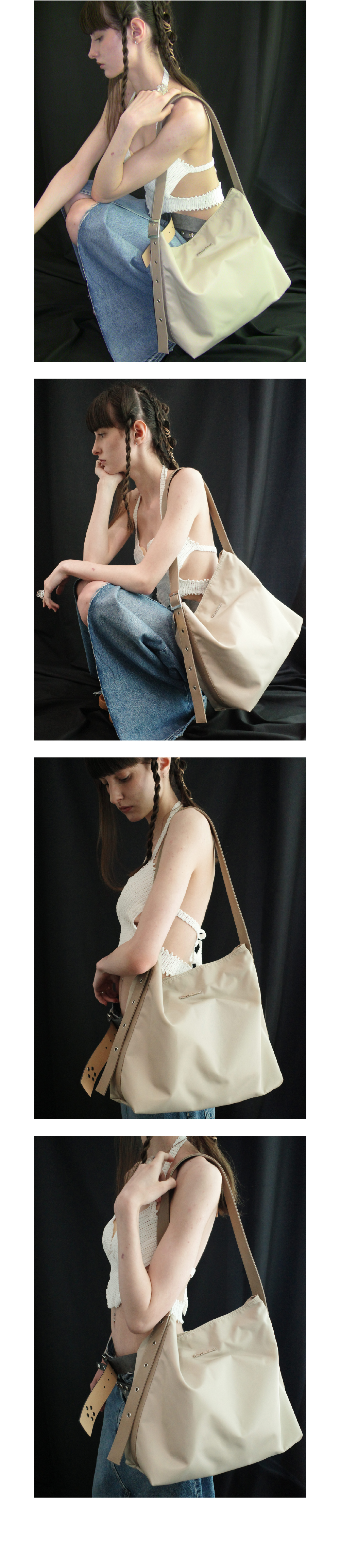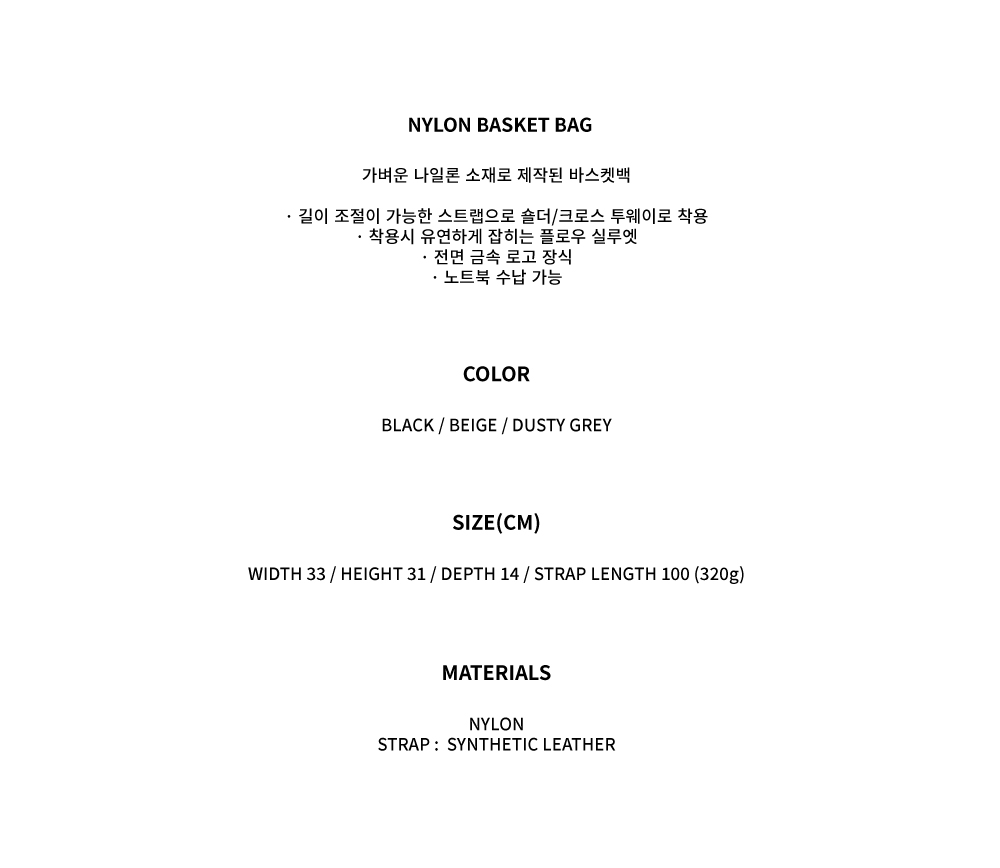 가벼운 나일론 소재로 제작된 바스켓백 · 길이 조절이 가능한 스트랩으로 숄더/크로스 투웨이로 착용 · 착용시 유연하게 잡히는 플로우 실루엣 · 전면 금속 로고 장식 · 노트북 수납 가능