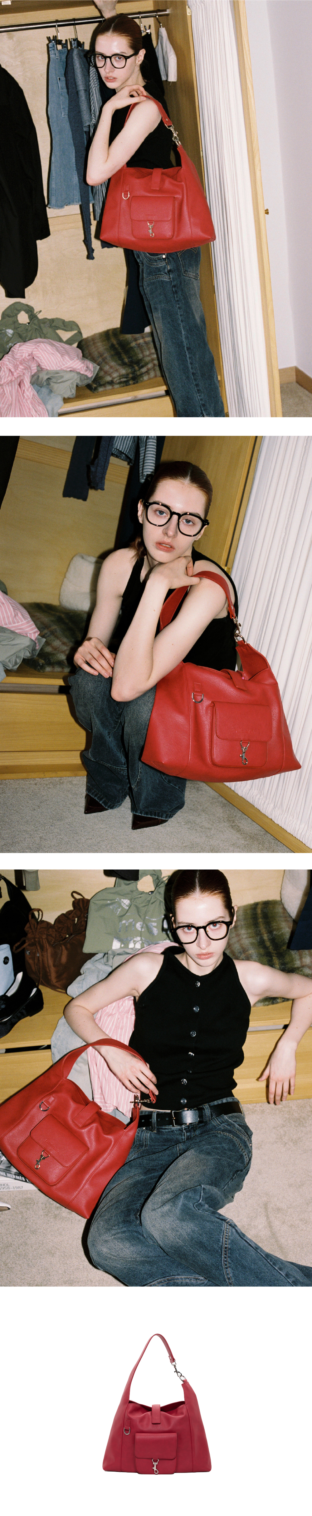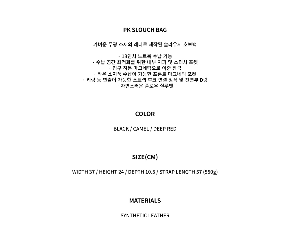 가벼운 무광 소재의 레더로 제작된 슬라우치 호보백 · 13인치 노트북 수납 가능 · 수납 공간 최적화를 위한 내부 지퍼 및 스티치 포켓 · 입구 히든 마그네틱으로 이중 잠금 · 작은 소지품 수납이 가능한 프론트 마그네틱 포켓 · 키링 등 연출이 가능한 스트랩 후크 연결 장식 및 전면부 D링 · 자연스러운 플로우 실루엣