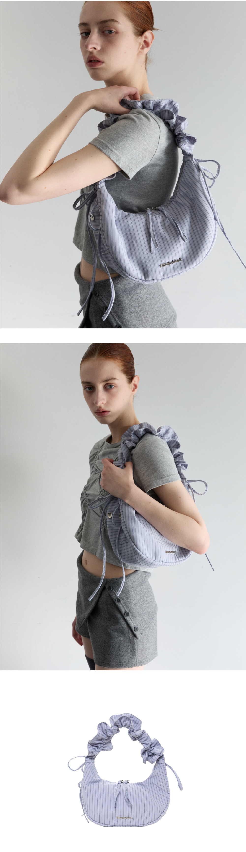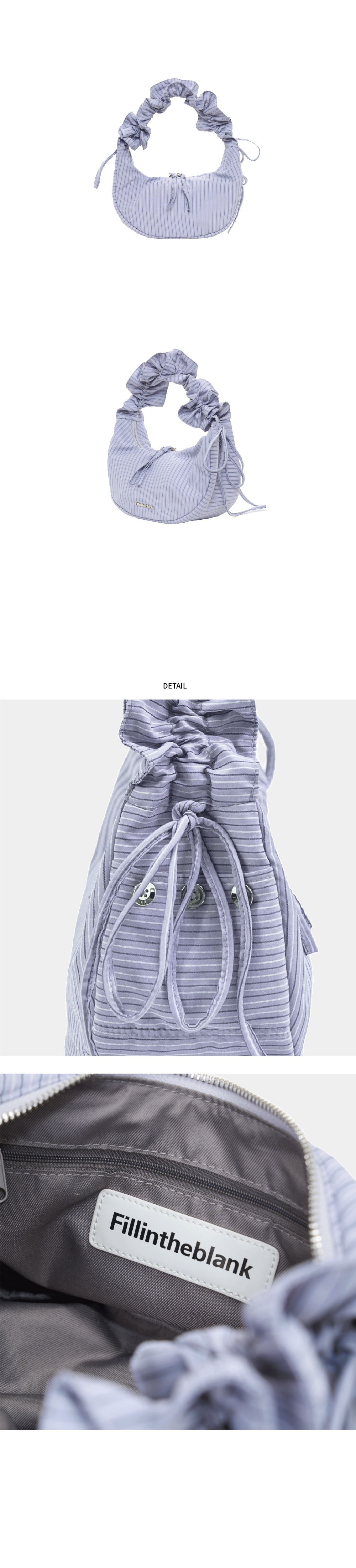 구겨진 셔츠를 모티프로 제작된 가벼운 투웨이백 · 스트랩 셔링부를 조절하여 크로스 등 다양한 사이즈로 DIY · 스트라이프 패턴 · 옆면 포켓 및 메탈 단추 장식 포인트 · 바디는 쿠션감있게 보강하여 제작 · 내부 포켓과 가죽 로고 라벨