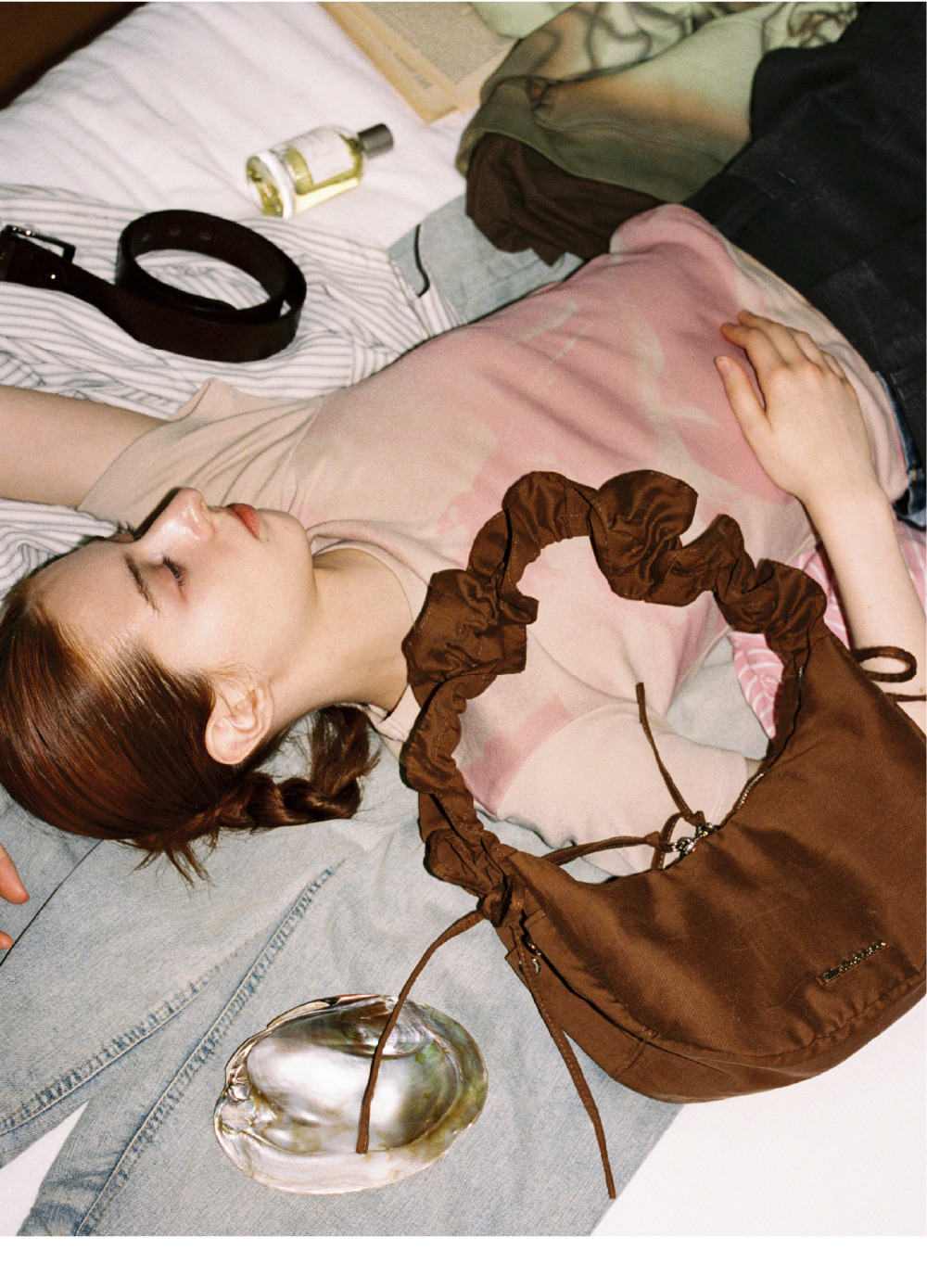 구겨진 셔츠를 모티프로 제작된 가벼운 투웨이백 · 스트랩 셔링부를 조절하여 크로스 등 다양한 사이즈로 DIY · 은은한 단색 camouflage 패턴 · 옆면 포켓 및 메탈 단추 장식 포인트 · 바디는 쿠션감있게 보강하여 제작 · 내부 포켓과 가죽 로고 라벨