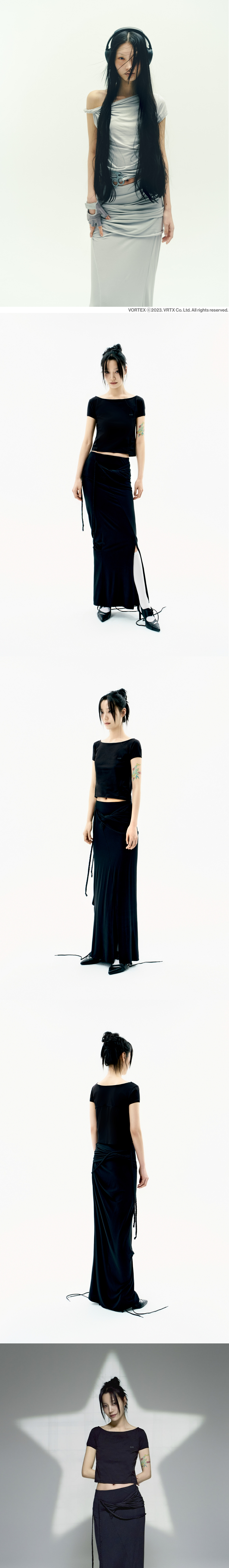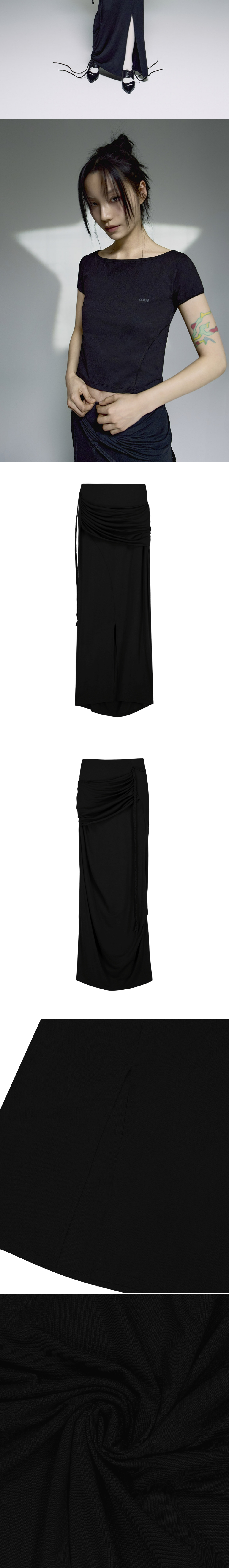 부드러운 텍스쳐의 드레이핑 맥시 스커트 | 슬림핏 | 부드러운 텐셀 스판 원단으로 유연한 착용감 | 허리 밴딩 마감으로 편안한 착용감 | 체형에 구애없이 안착되는 셔링 패널 레이어드 디자인 | 전면 턱 디테일 | 후면 절개라인과 이어지는 트임 디테일 | 끈고리, 탈부착 스트랩 활용하여 다양한 스타일링 가능 * 동시즌 [ Twisted Tuck Cap Sleeves ]와 셋업 아이템 * Model is 168cm and wears size 2.