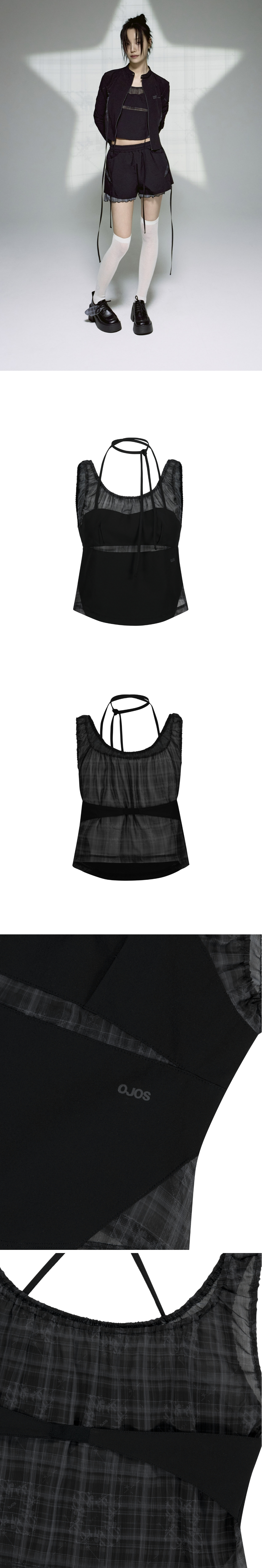 OJOS 체크 패턴을 사용한 슬리브리스 탑 | 크롭핏 | 4way 스트레치 이중직 나일론 소재 사용으로 편안한 착용감 | OJOS 패턴이 들어간 쉬폰 소재 사용 | 라운드 헴 라인 | 전면 다트, 슬릿 배색 디테일 | 전면 스트랩을 활용하여 다양한 스타일링 가능 | 전면 OJOS 로고 전사 | 후면 밴딩 디테일 * 동시즌 [ Reversible Plaid Track Shorts ]와 셋업 아이템 * Model is 168cm and wears size 2.