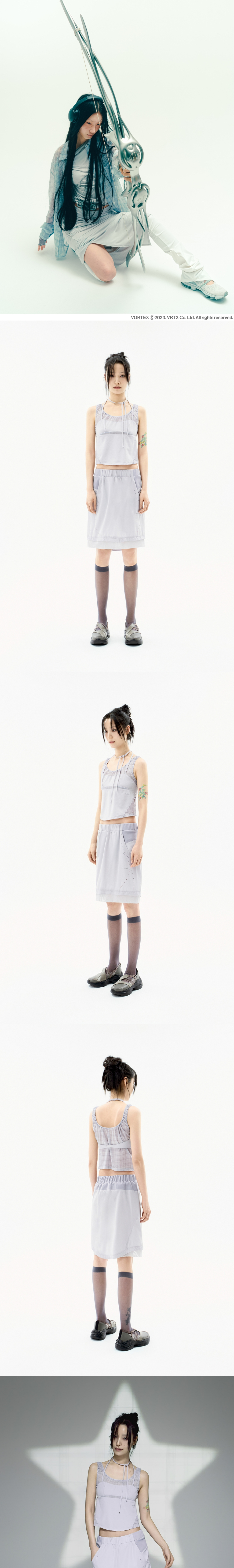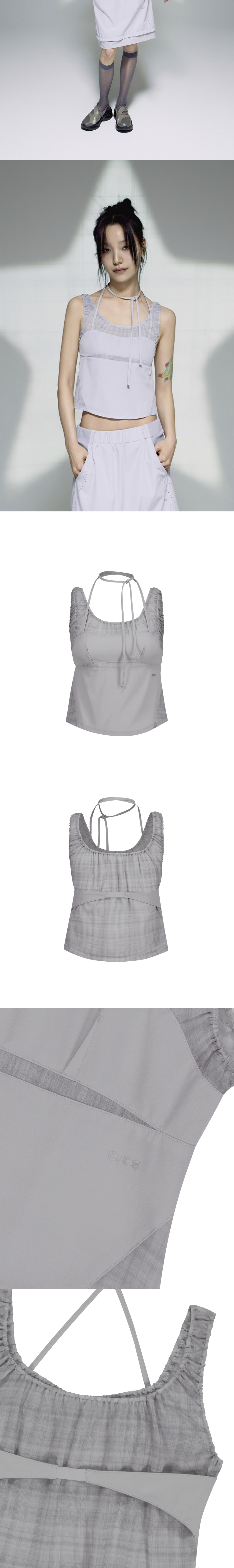 OJOS 체크 패턴을 사용한 슬리브리스 탑 | 크롭핏 | 4way 스트레치 이중직 나일론 소재 사용으로 편안한 착용감 | OJOS 패턴이 들어간 쉬폰 소재 사용 | 라운드 헴 라인 | 전면 다트, 슬릿 배색 디테일 | 전면 스트랩을 활용하여 다양한 스타일링 가능 | 전면 OJOS 로고 전사 | 후면 밴딩 디테일 * 동시즌 [ Reversible Plaid Track Shorts ]와 셋업 아이템 * Model is 168cm and wears size 1.