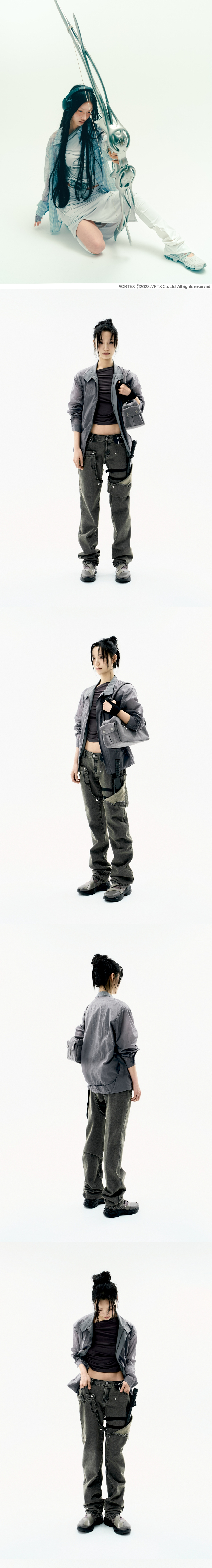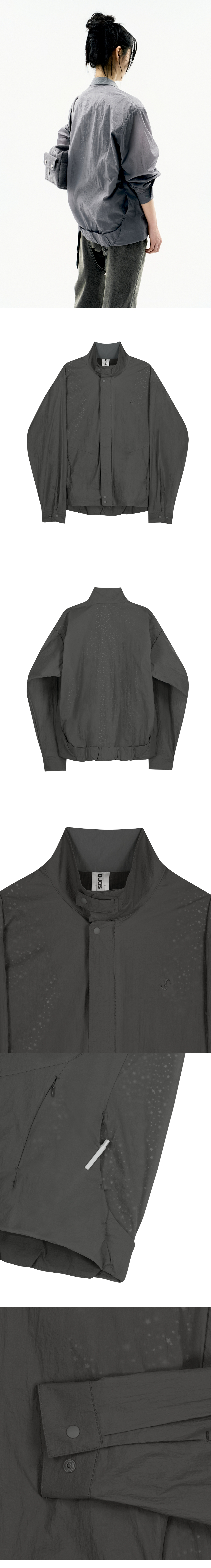 시스루 디테일의 가벼운 나일론 봄버 자켓 | 오버핏 | 은은하게 비치는 패턴안감 | 여름철 가벼운 나일론 소재감의 원마일 웨어 자켓 | 다트 절개로 이어지는 사이드 포켓 | 전면패널과 뒷 밴드패널에 원단 2겹이 크로스 오버되는 디테일 + 보조포켓 | 전면 OJOS 로고 자수 | 전면에 YKK 지퍼 및 OJOS 로고 풀러 마감 * Model is 168cm and wears size 3.